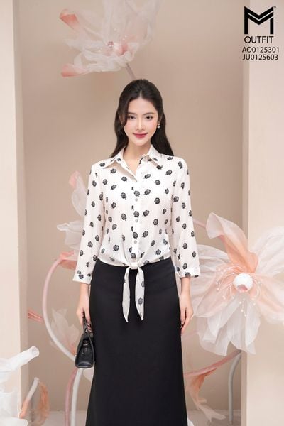 Áo cổ tròn tay lỡ thân đính cúc bọc mix với chân váy JUT0825625