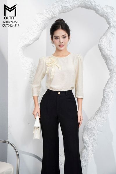 Áo kí giả cổ tròn tay lỡ nhún bồng vai mix với quần QUT0824522