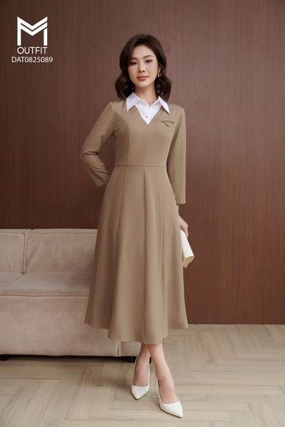 Đầm xòe bổ thân phối cổ sơ mi trắng