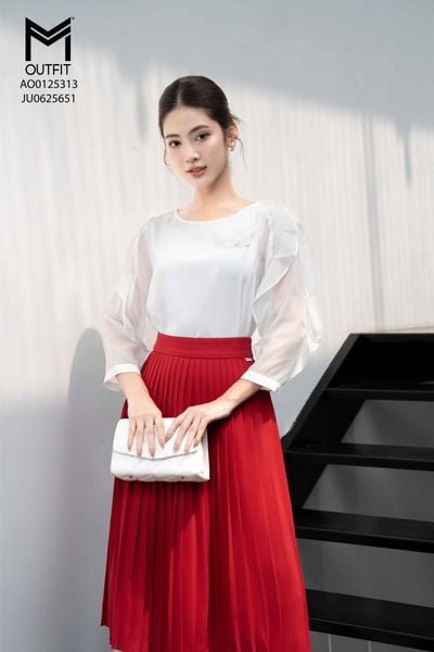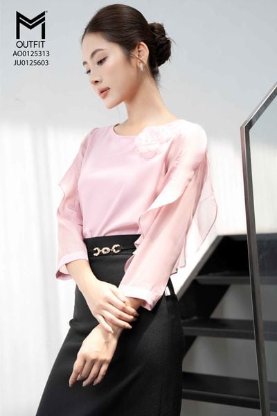 Áo sơ mi tay phối tơ bèo đổ, đính hoa cổ