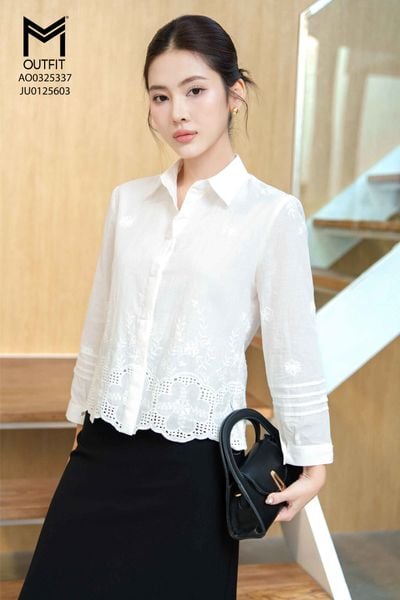 Áo sơ mi cổ 2 ve 4 cúc bọc, đính hoa ở cổ áo