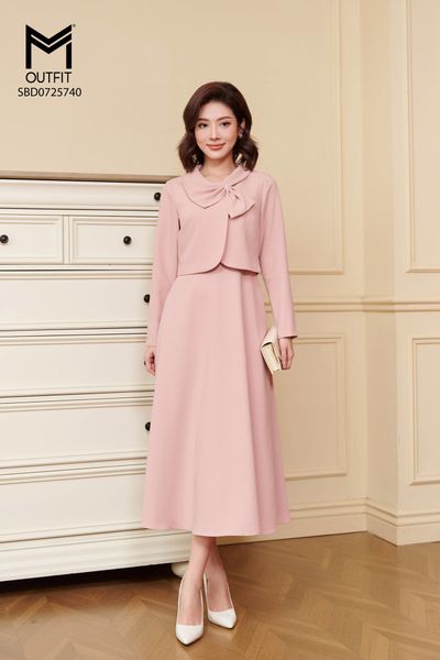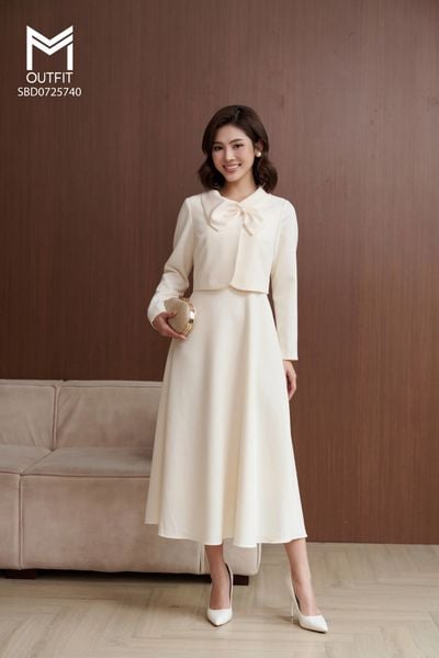 Set bộ áo khoác cổ luồn nơ và đầm sát nách xòe