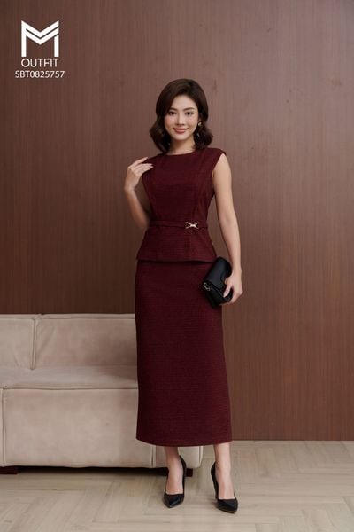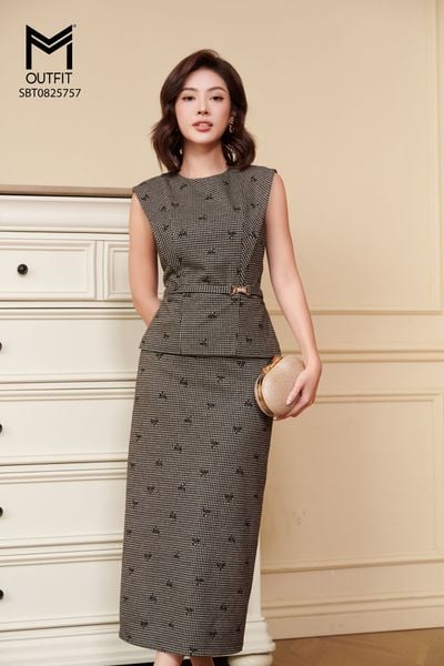 Set bộ áo sát nách đính đai trang trí mix chân váy bút chì thẳng