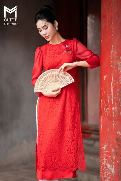Áo Dài Ren Cộc Tay, Đính Hoa Trang Trí, Quần Màu Be