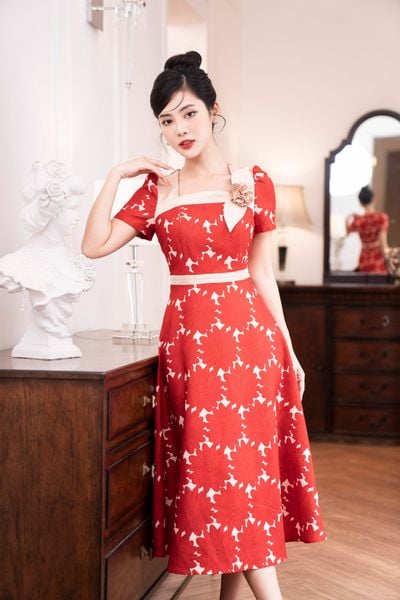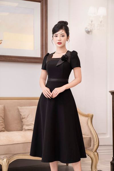Đầm dáng A rộng, cổ U, đính hoa TT