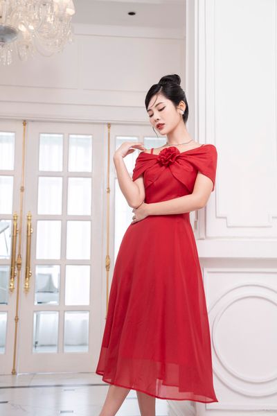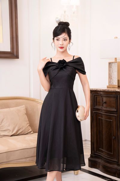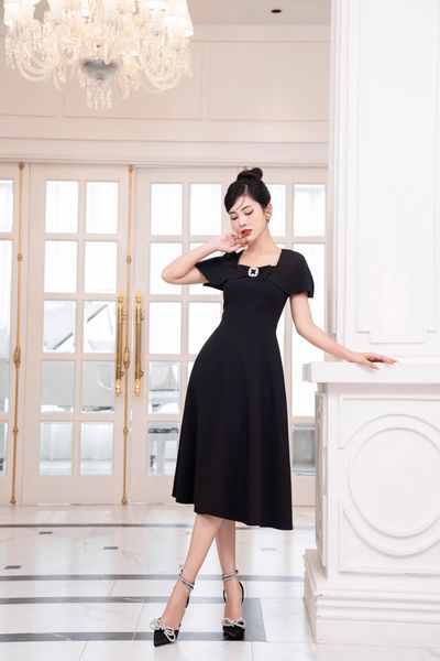 Đầm dáng xòe, tà bong, đính khuy đá TT