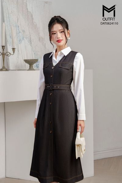 Đầm bò sát nách thân đính cúc, túi ngực giả, đai cài rời