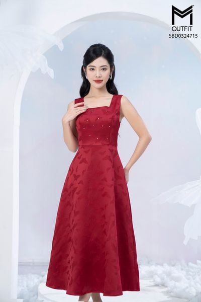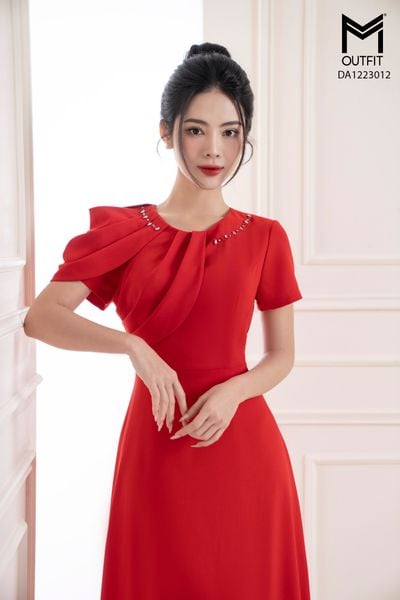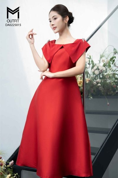 Đầm tiệc xòe tà nhún 2 bên vai đính cúc đá trang trí