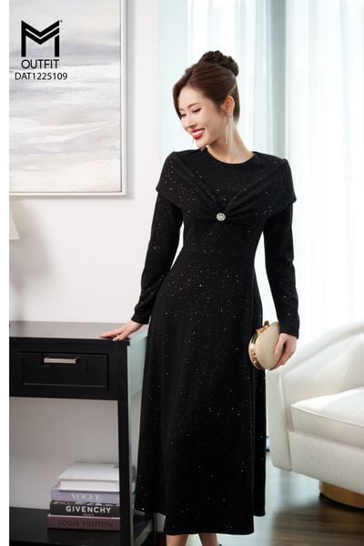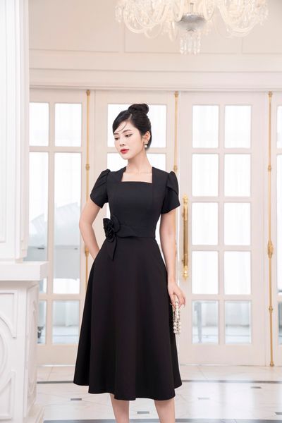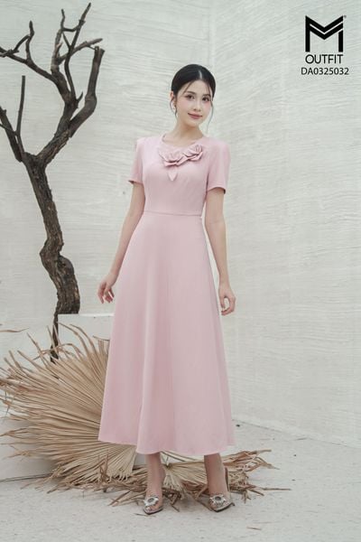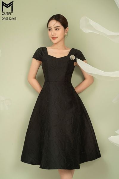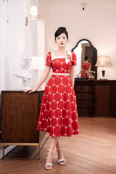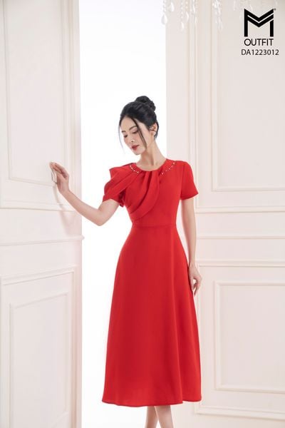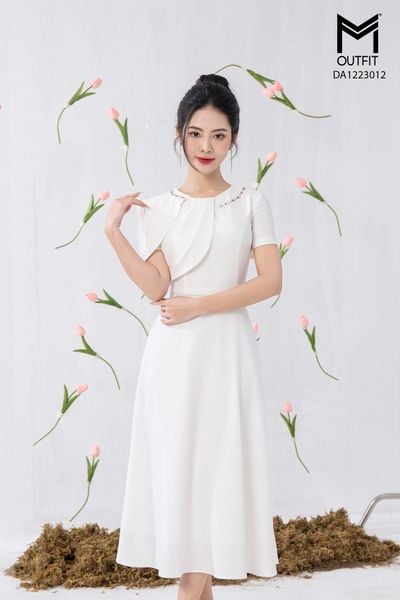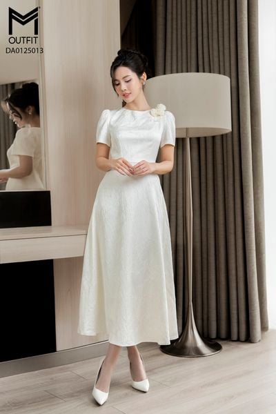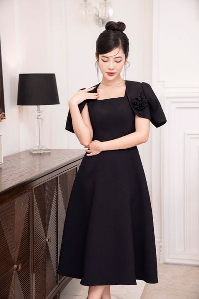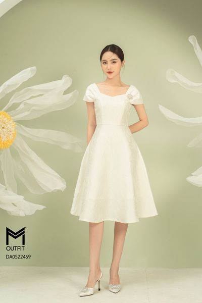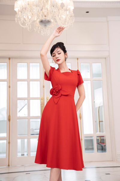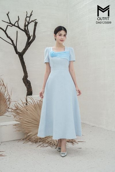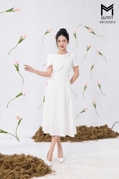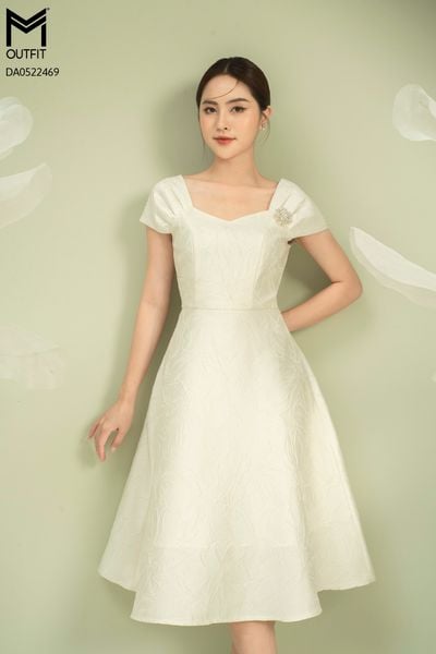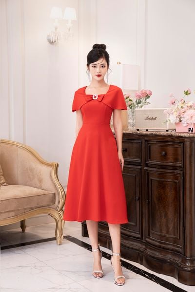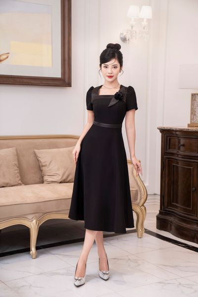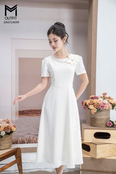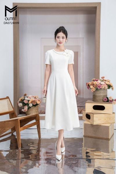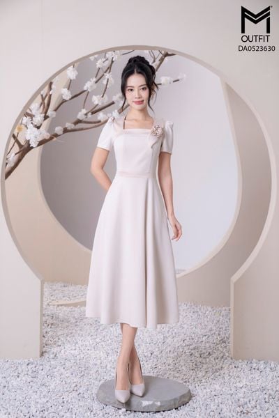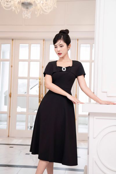 Đầm dáng xòe, cổ U, cài hoa đá TT