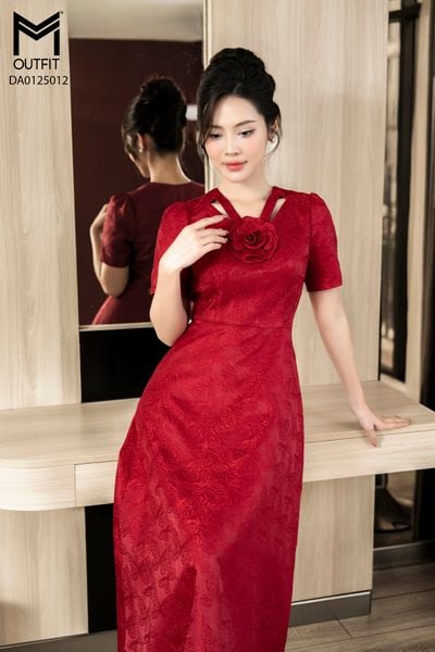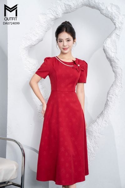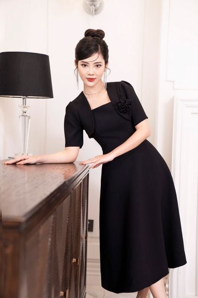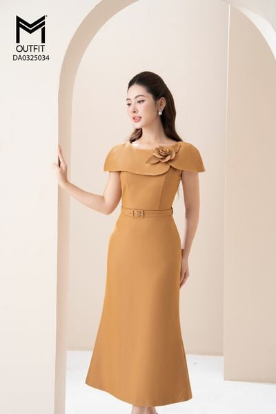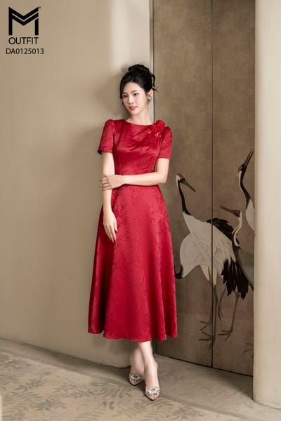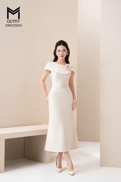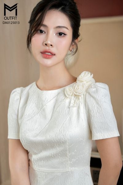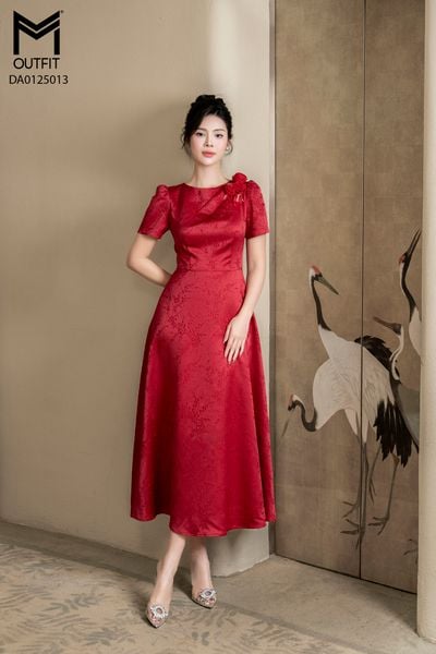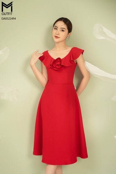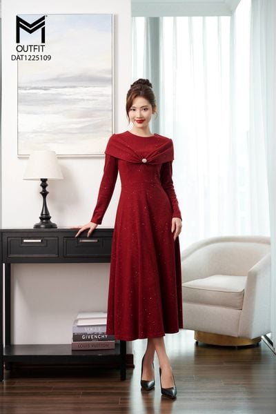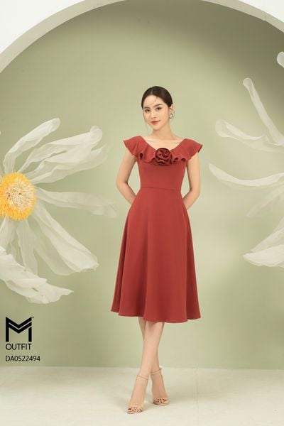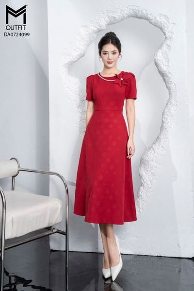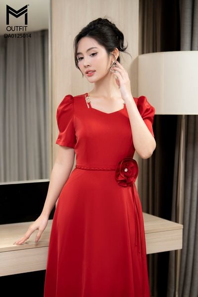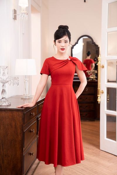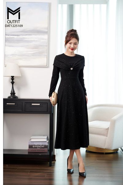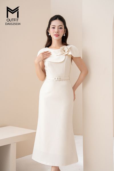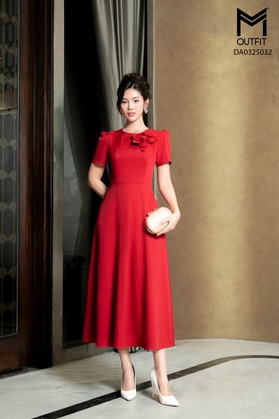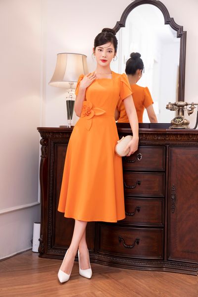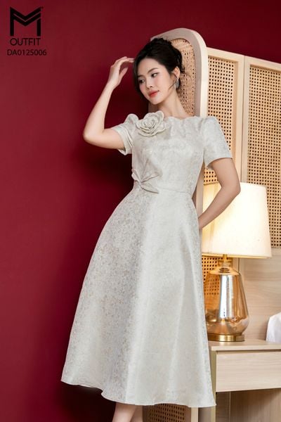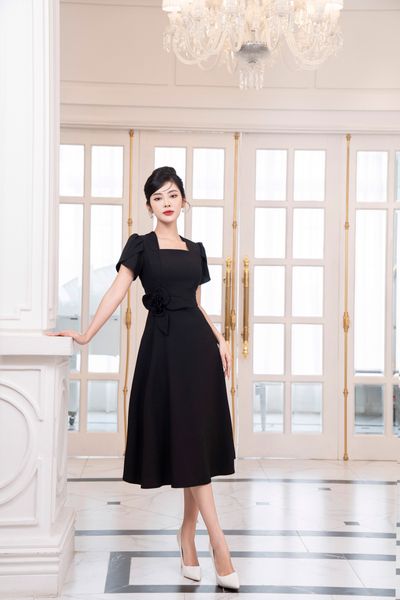 Đầm dáng xòe, cổ U, cài hoa đá TT