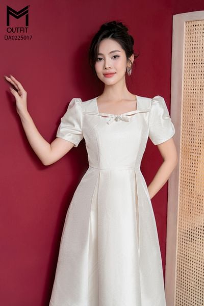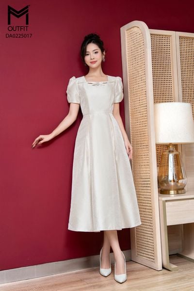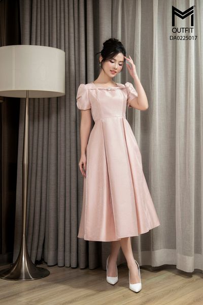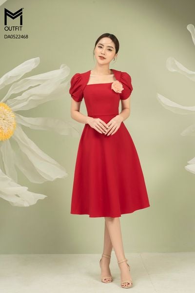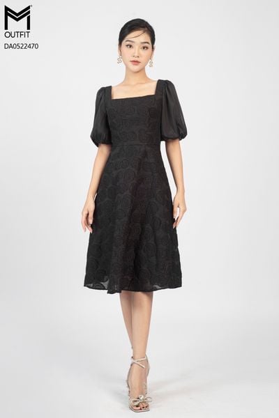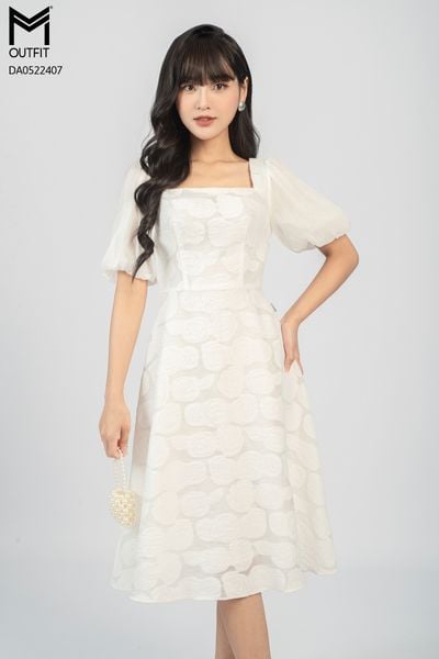 Đầm dáng xòe, cổ U, tay bồng