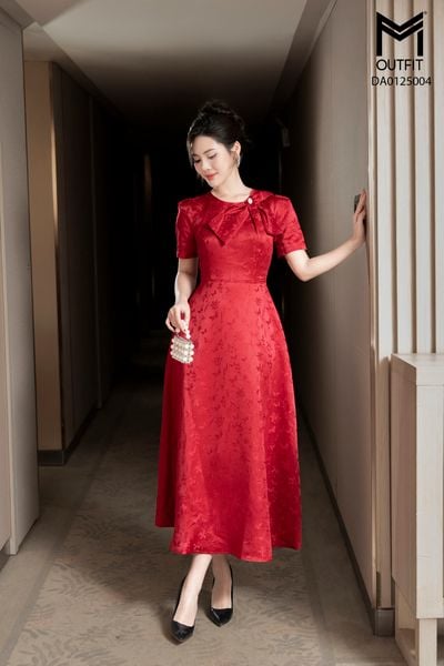 Đầm tiệc xòe cổ nơ đính đá, dài 130cm