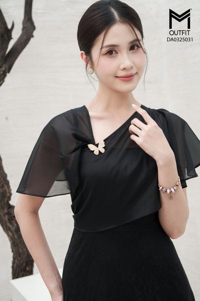 Đầm tiệc ren xòe thân trên phối tơ rủ đính trâm cài hình bướm