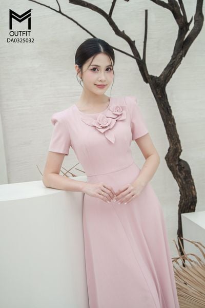 Đầm dáng xòe, tay nụ hồng đính hoa TT