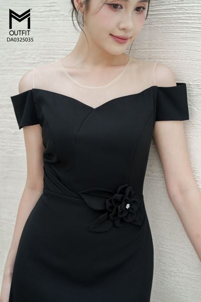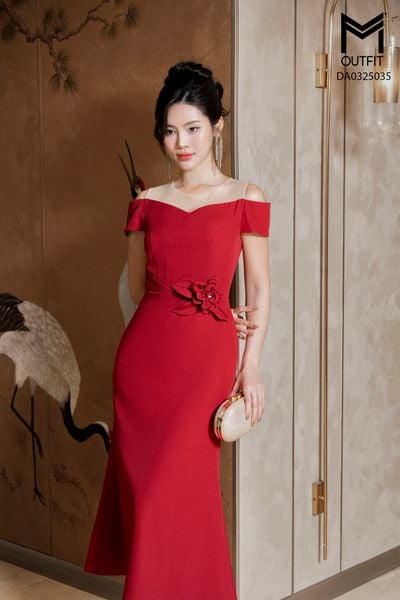 Đầm tiệc tùng xòe vai trang trí đính hoa eo