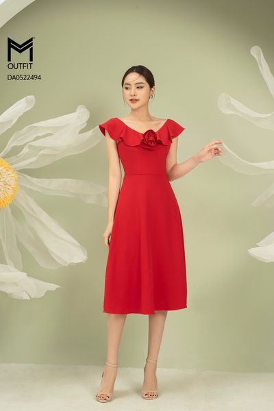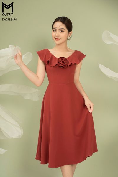 Đầm dáng xòe, cổ V bèo rủ đính hoa TT