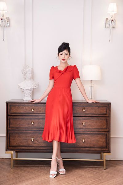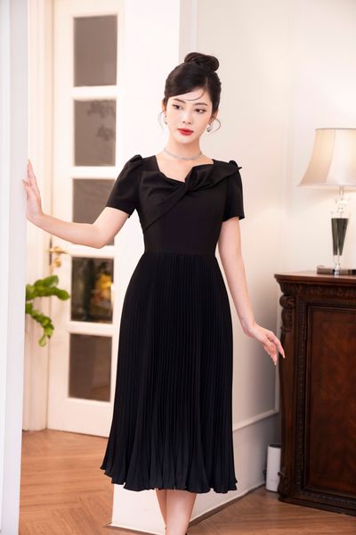Đầm tiệc cổ đính nơ đá tay xếp ly chụm
