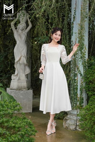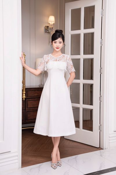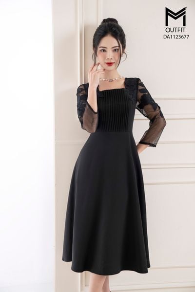 Đầm dáng xòe, cổ U, phối tay ren