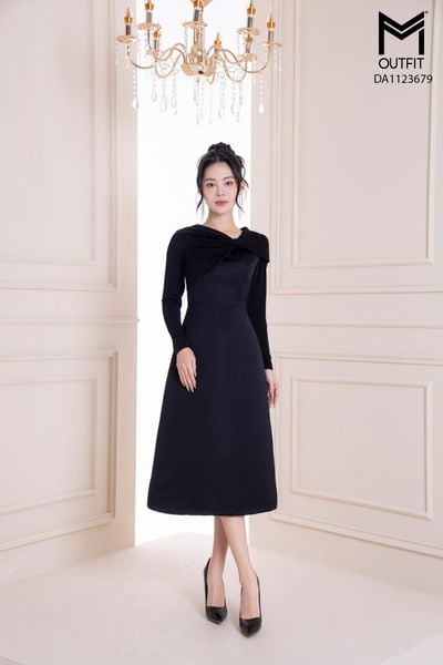 Đầm dáng A, tay dài, cổ xoắn