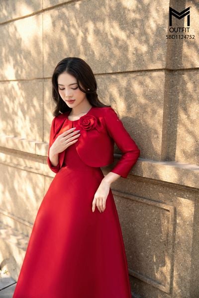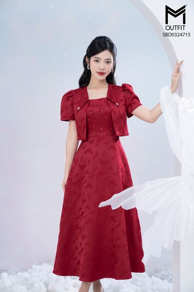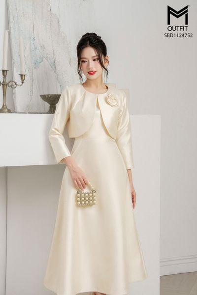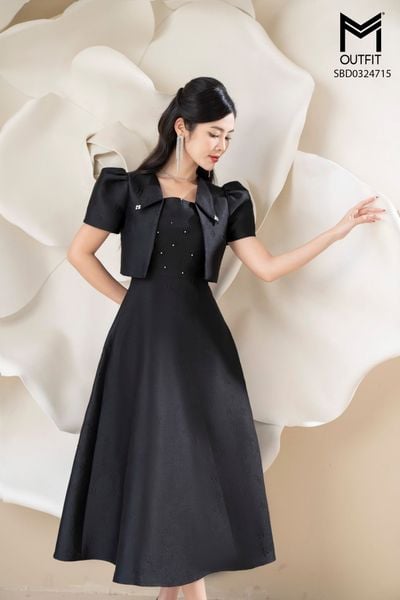 Sét bộ tapta đầm sát nách tùng xòe kết hợp áo khoác lửng đính hoa ngực