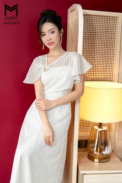 Đầm tiệc dáng xòe phối tơ chờm vai