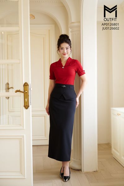 Chân váy bút chì thẳng cạp cách điệu đính đai giả