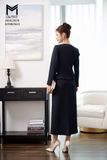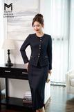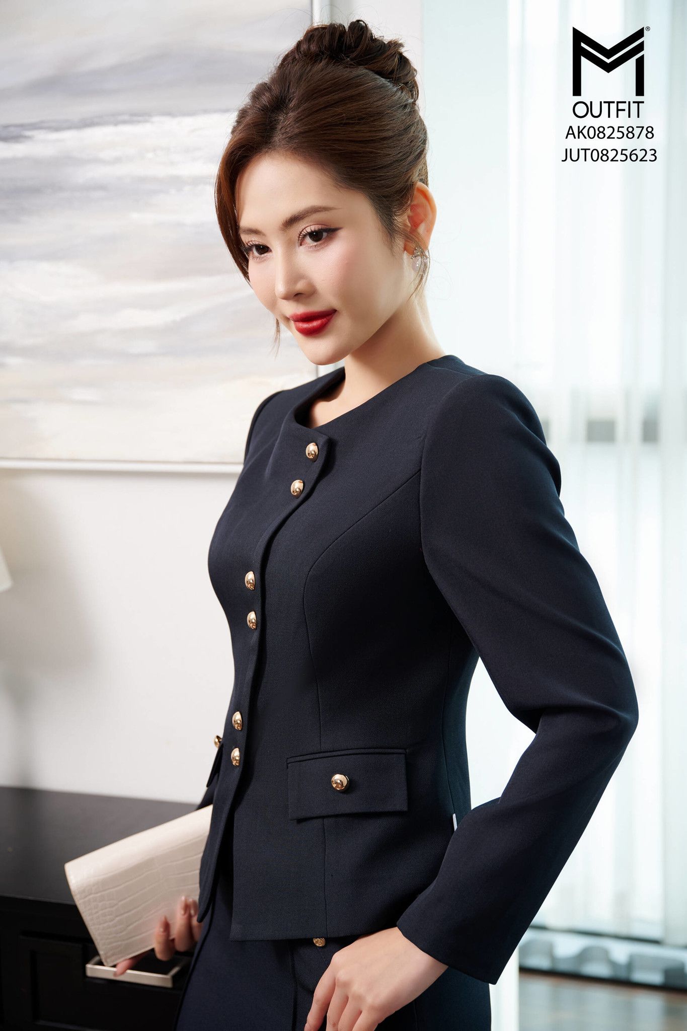 | Đặc điểm | Áo khoác cổ tròn vạt lệch có túi đính cúc kim loại |