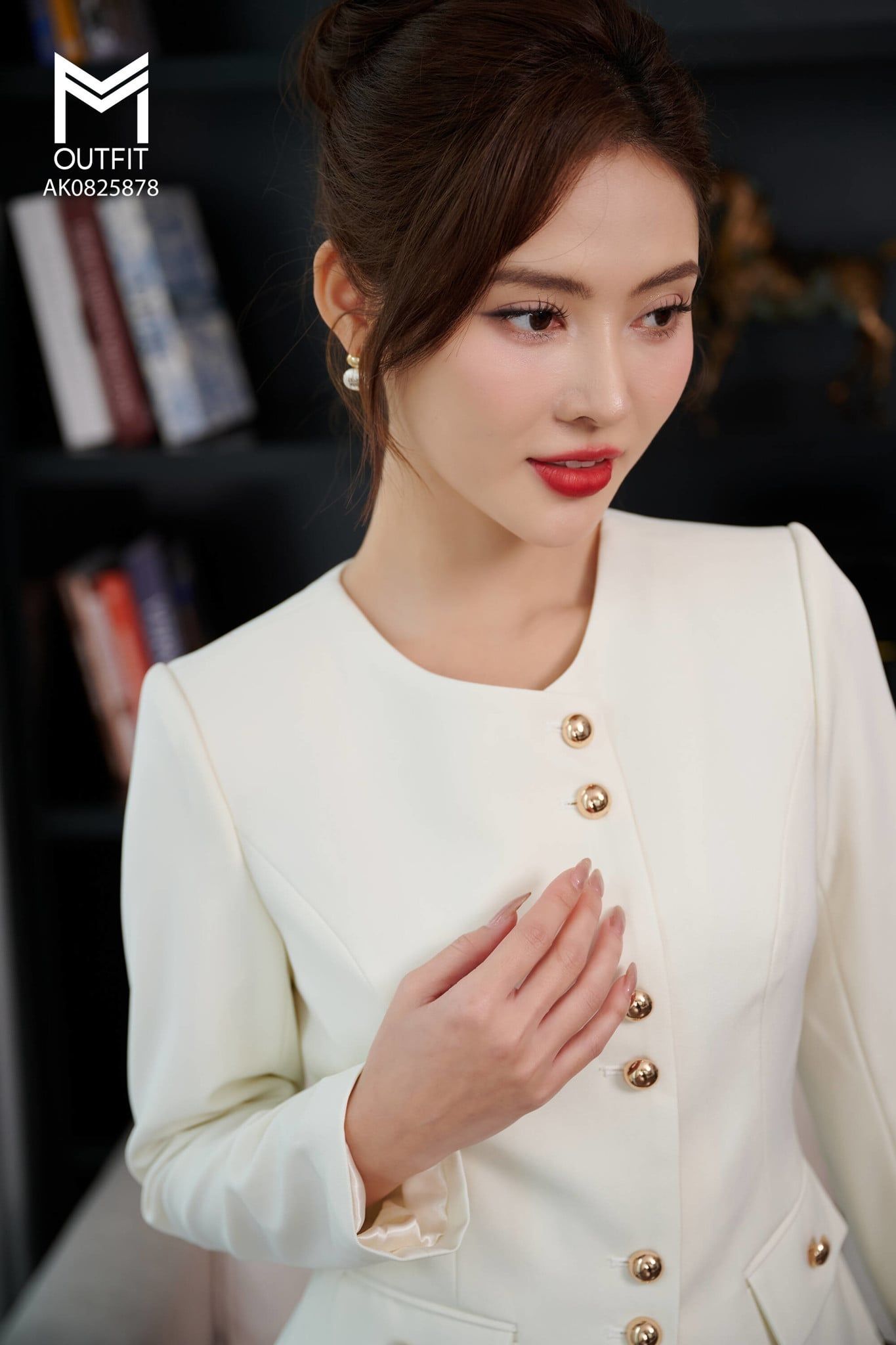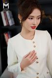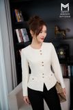 | Đặc điểm | Áo khoác cổ tròn vạt lệch có túi đính cúc kim loại |