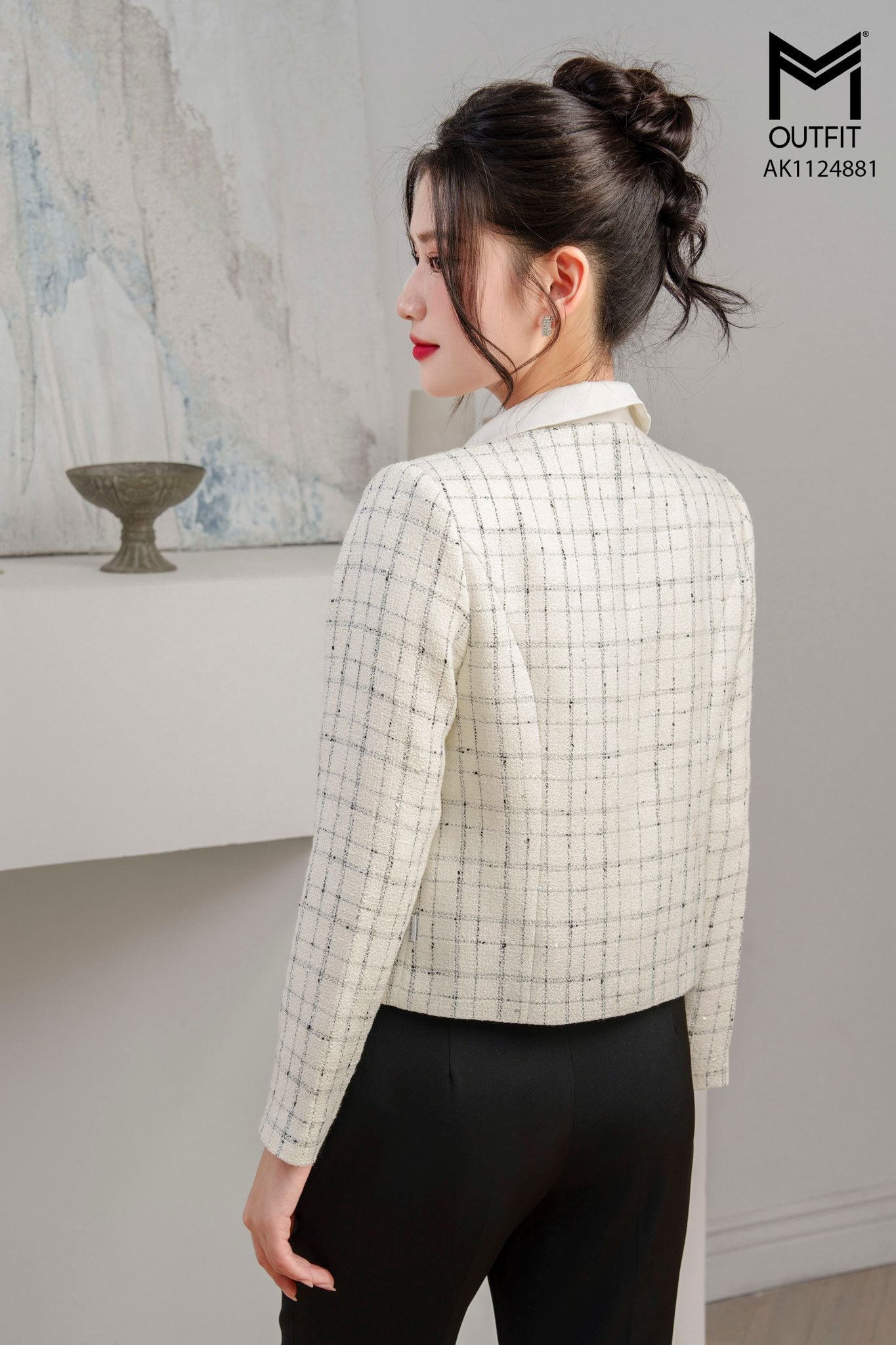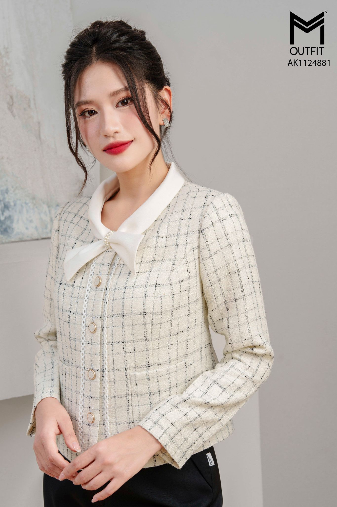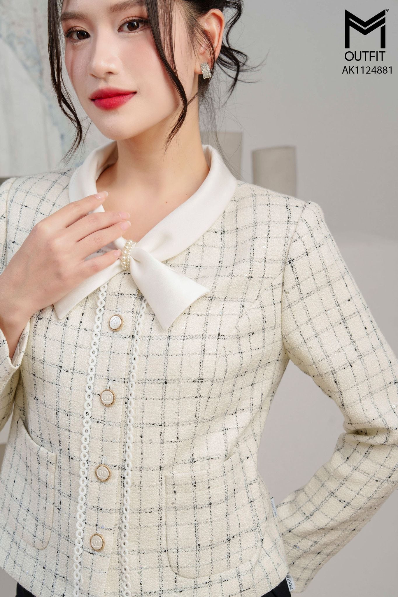 | Đặc điểm | Áo khoác dạ tweed dáng suông eo cổ phối lụa trắng |