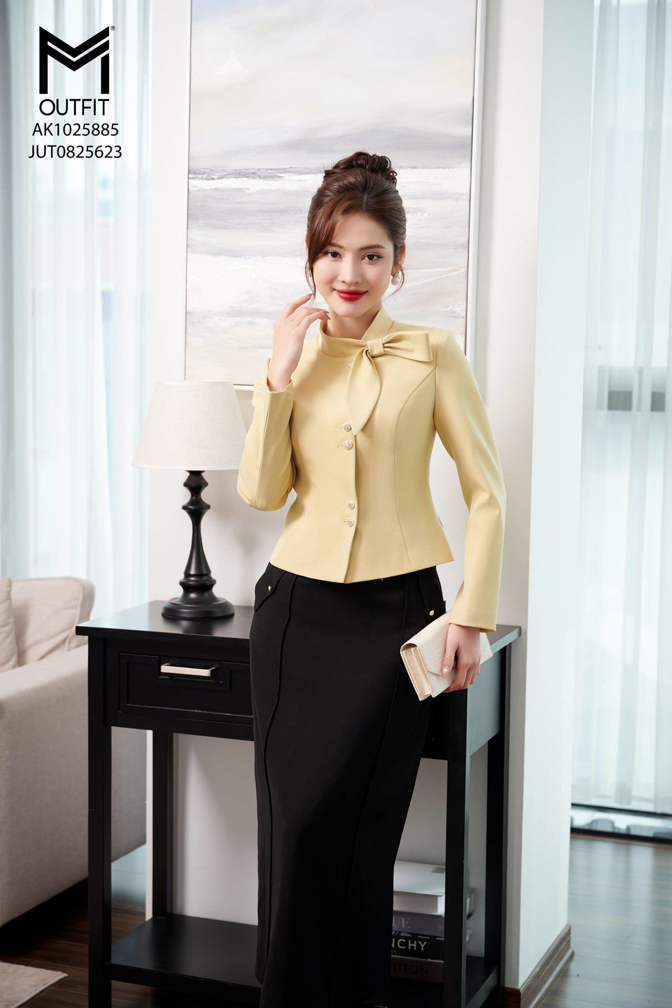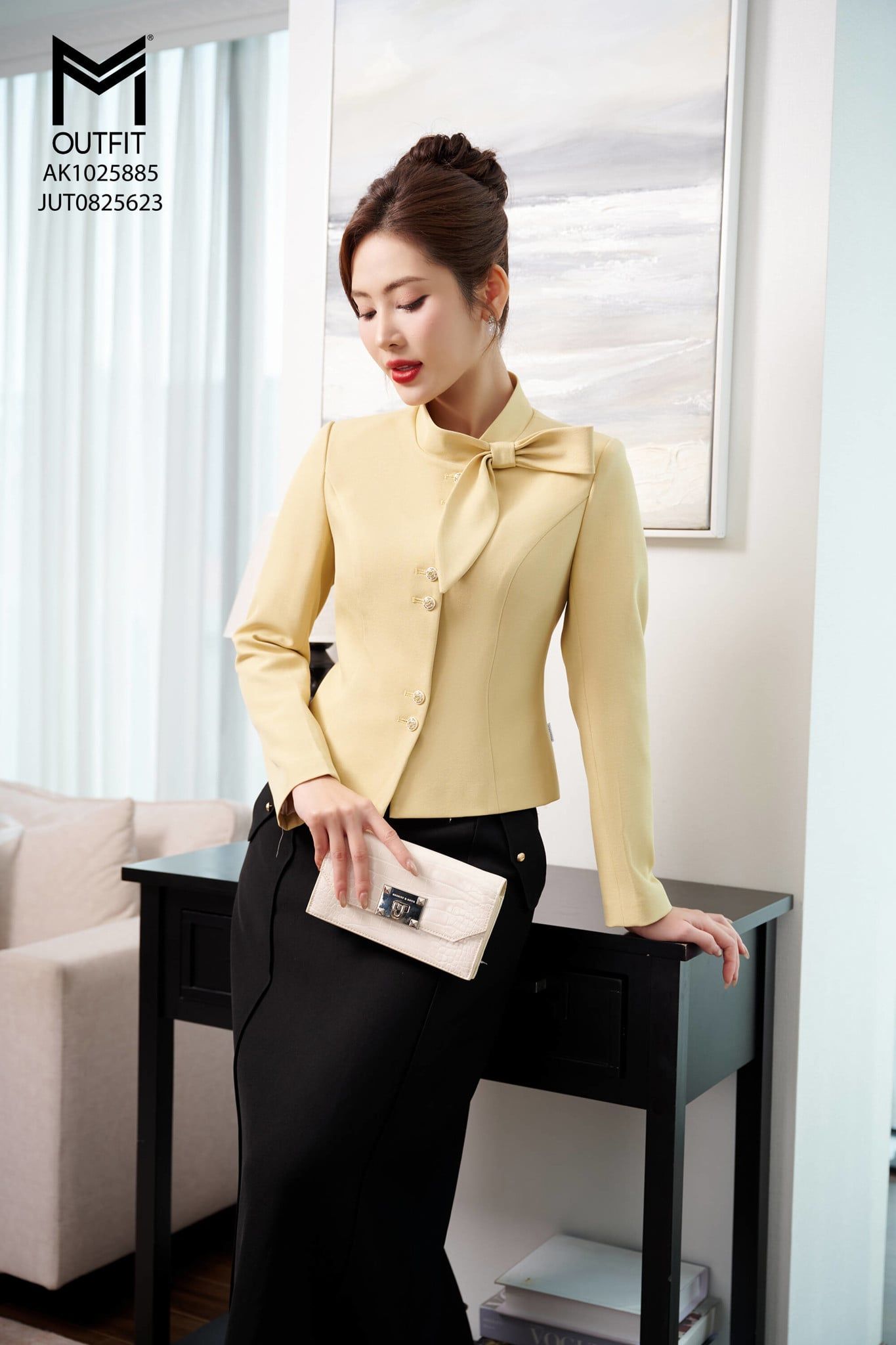 | Đặc điểm | Áo khoác dài tay cổ luồn nơ đính cúc đá |
