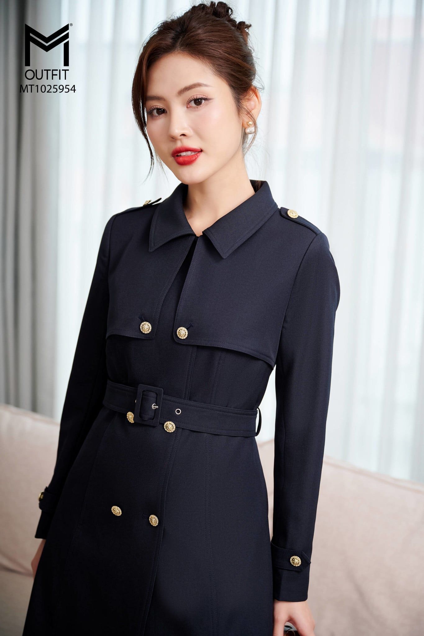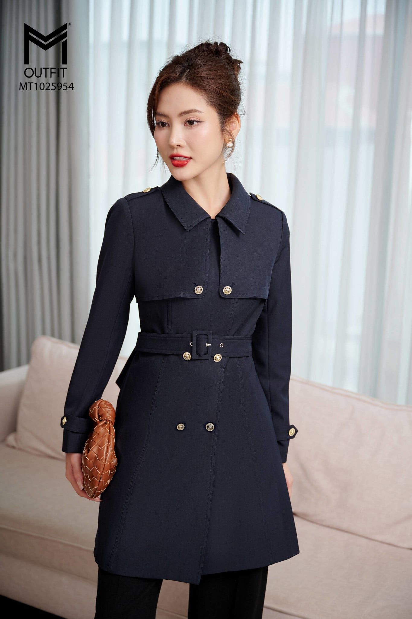 | Đặc điểm | Áo măng tô dáng ôm đính cá vai có đai eo |