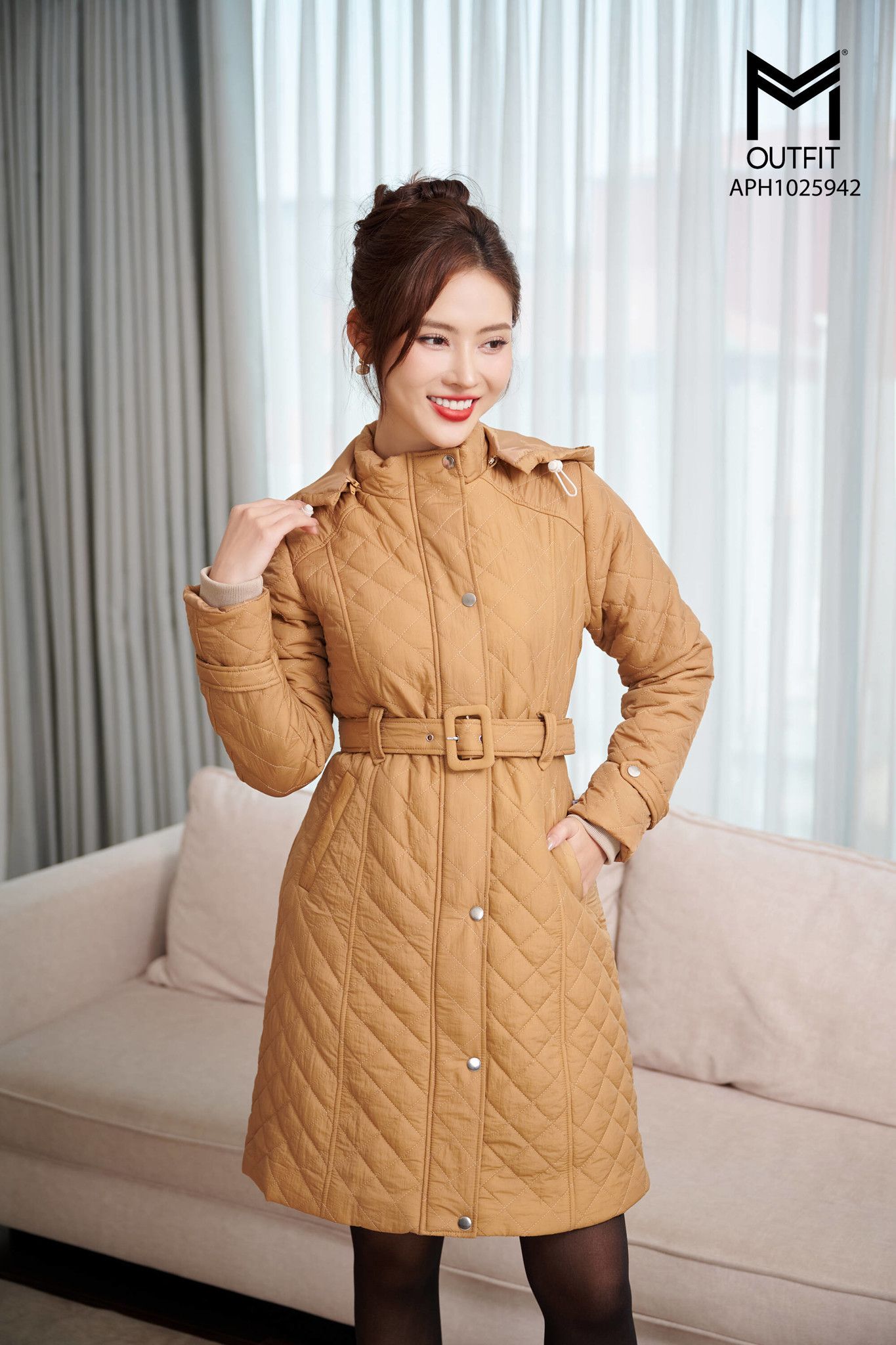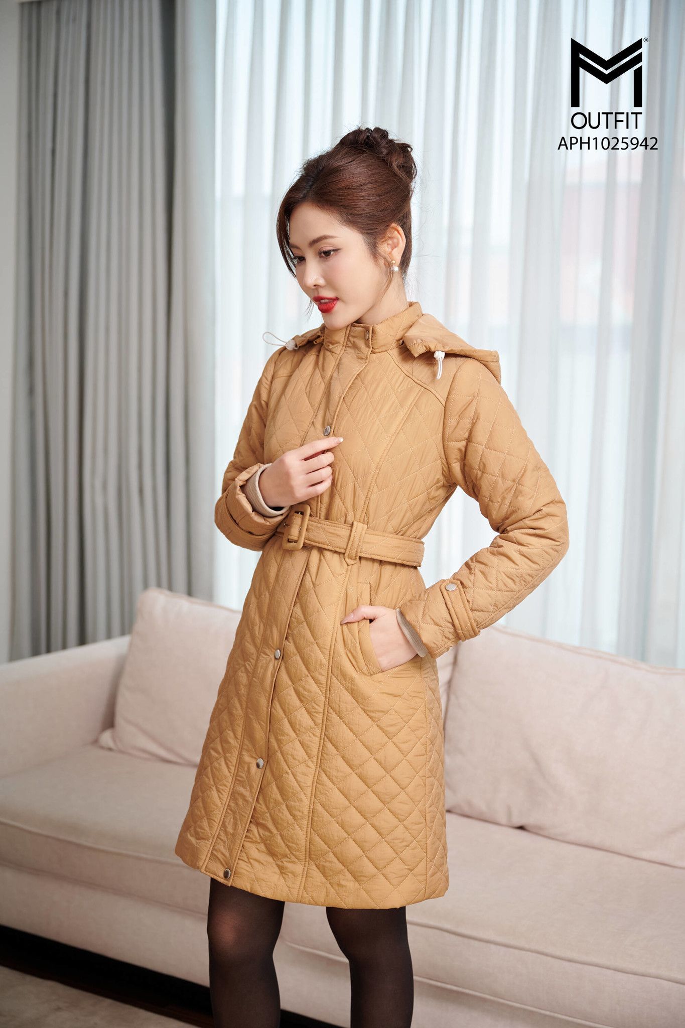 | Đặc điểm | Áo phao dài dáng ôm có mũ, có đai cài |