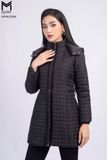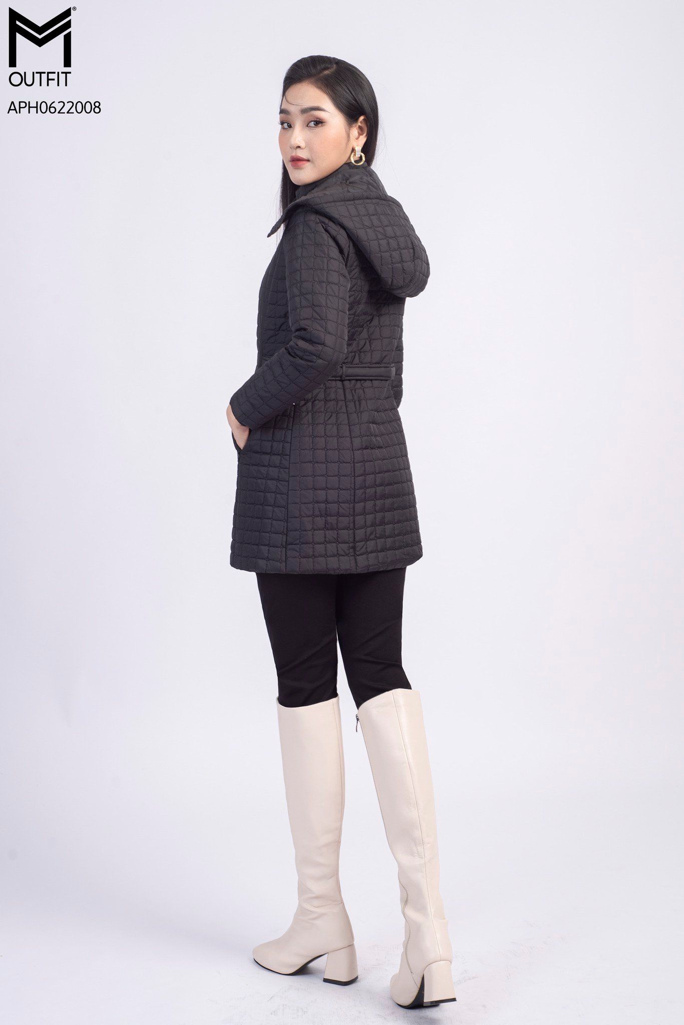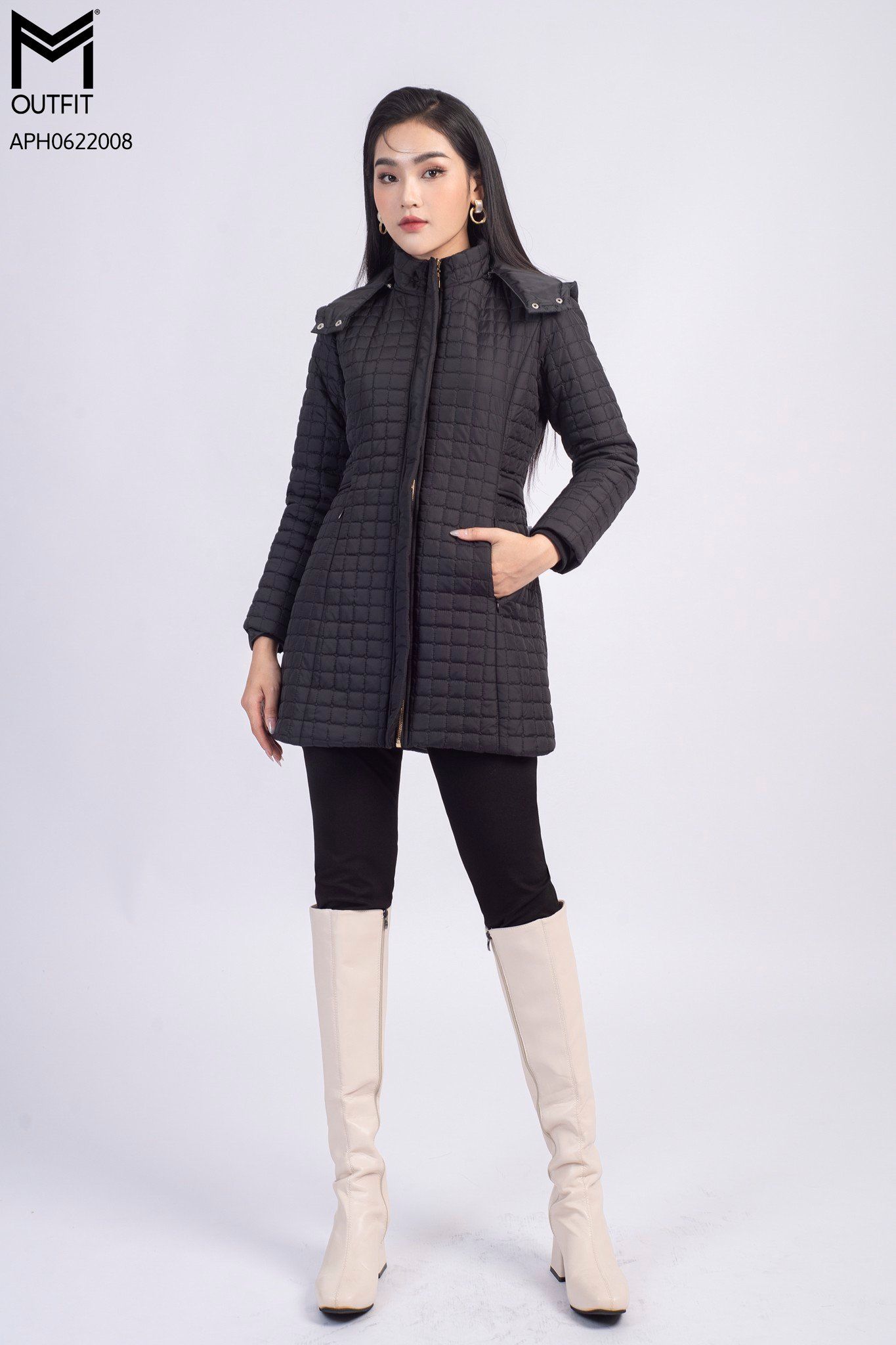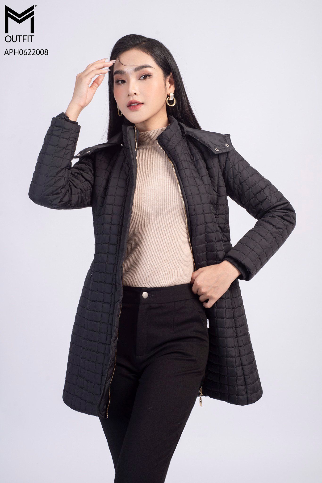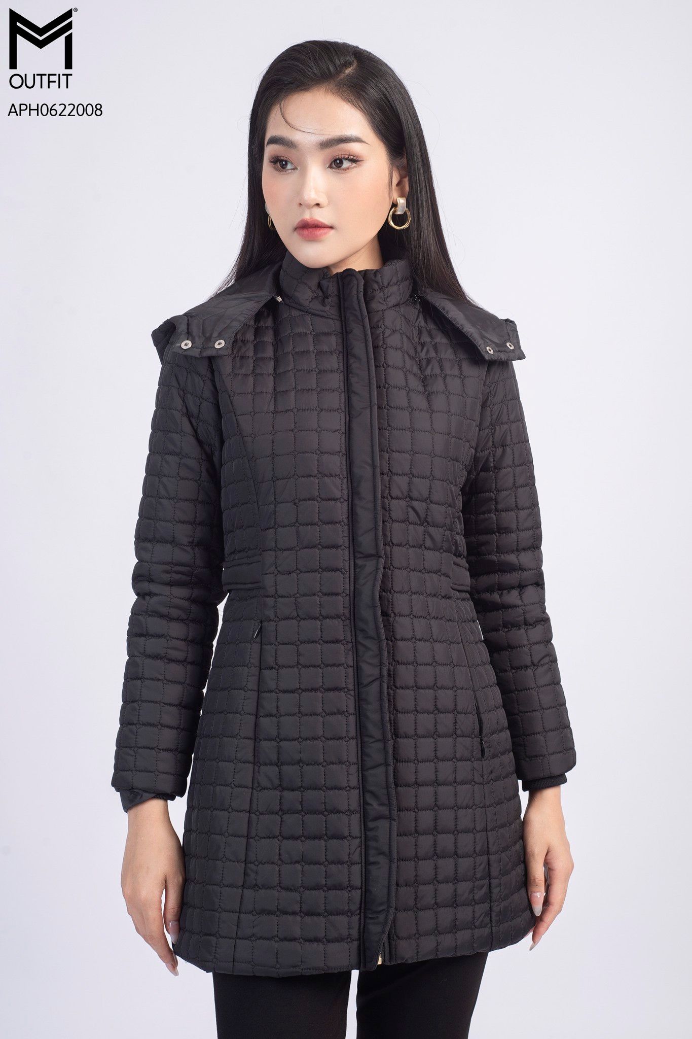 | Đặc điểm | Áo phao dáng dài, trần ô vuông, có mũ |