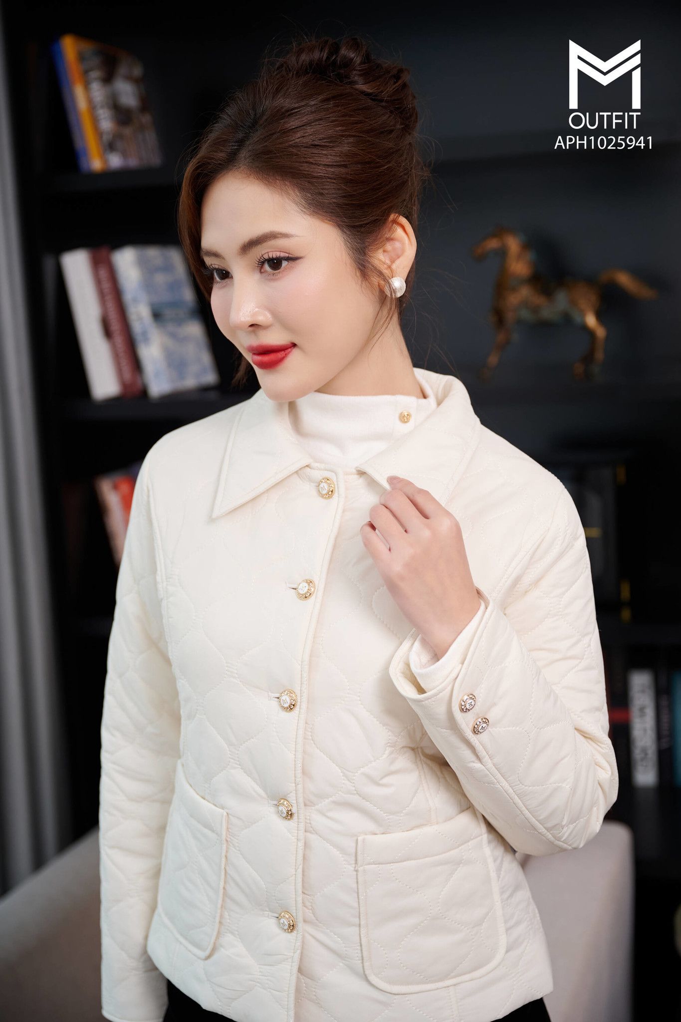 | Đặc điểm | Áo phao dáng ngắn cổ bẻ có túi trước than và tay áo đính cúc đá |