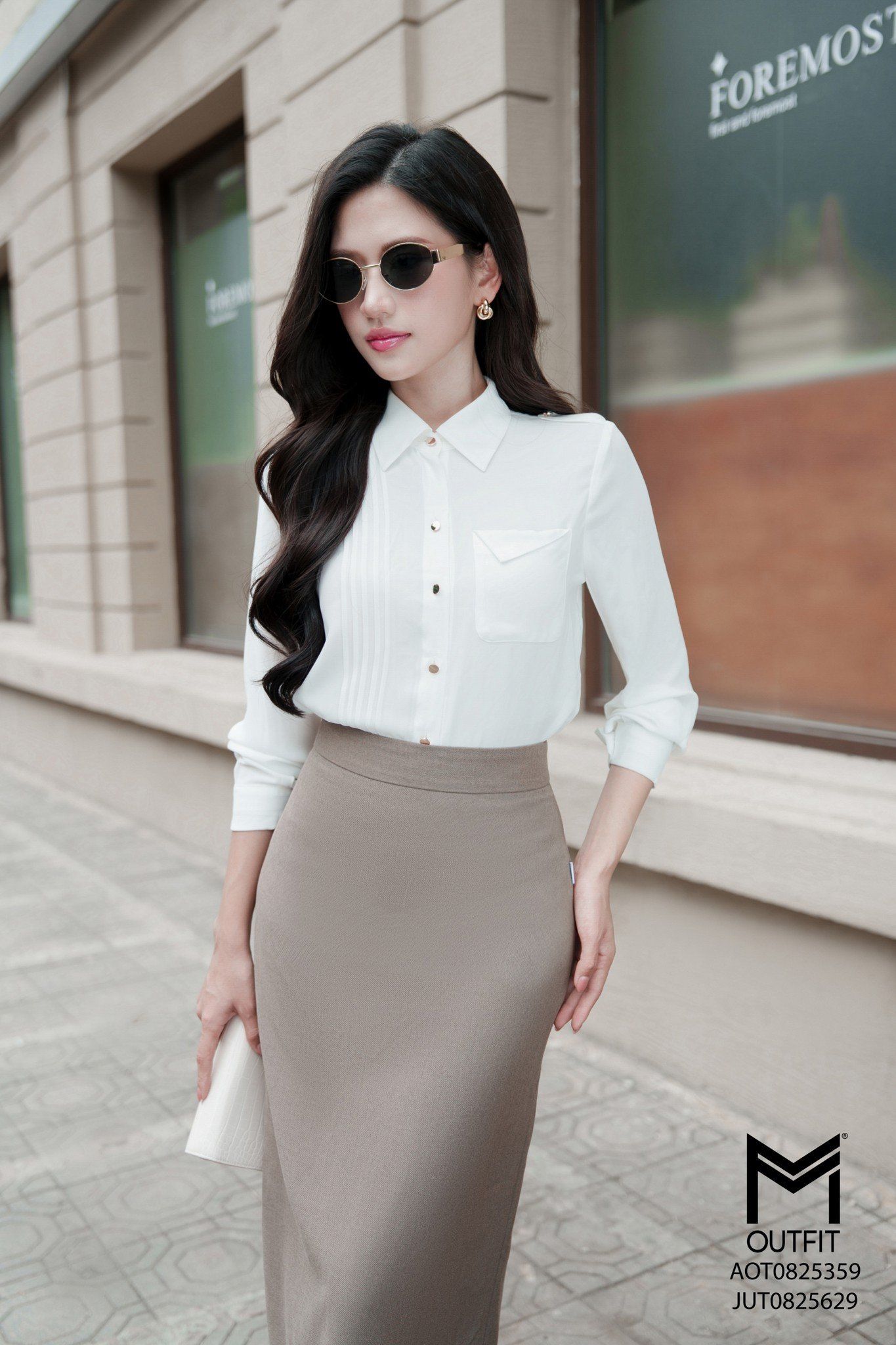 | Đặc điểm | Áo sơ mi dáng suông có túi ngực đính cá vai |