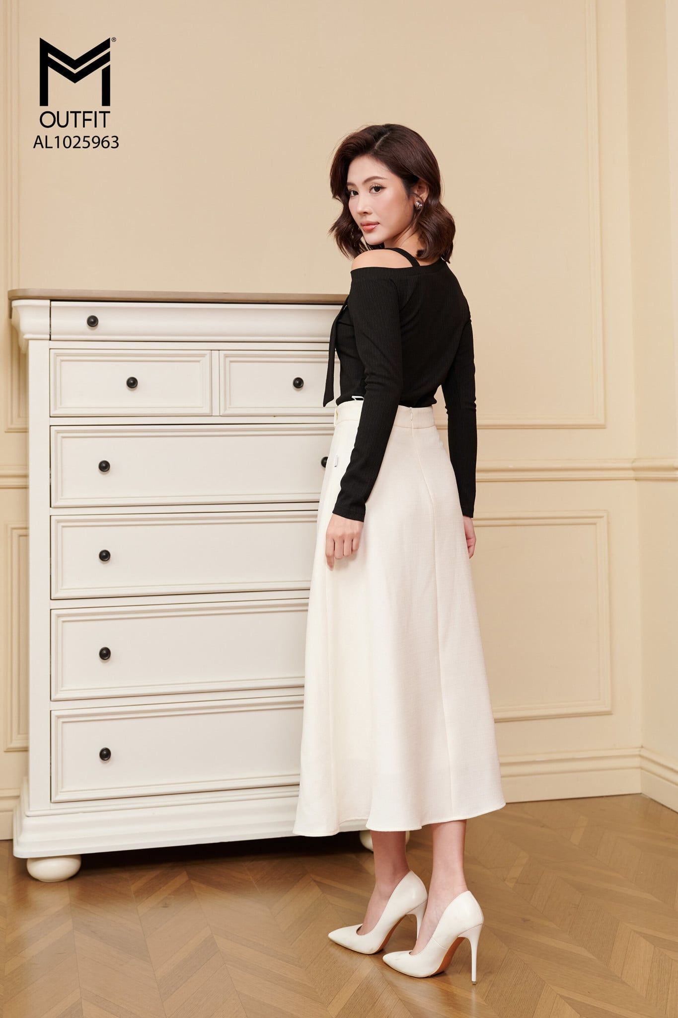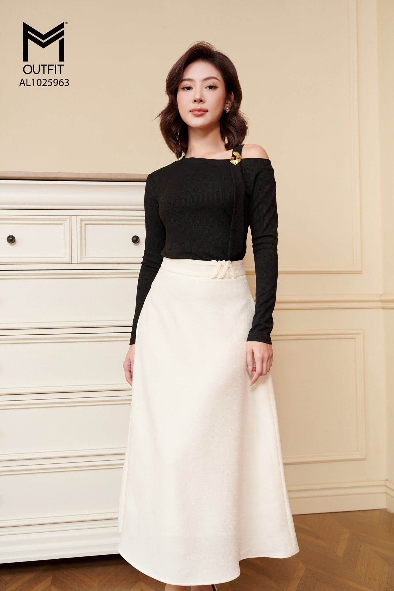 | Đặc điểm | Áo thun cách lệch vai đính cúc trang trí |