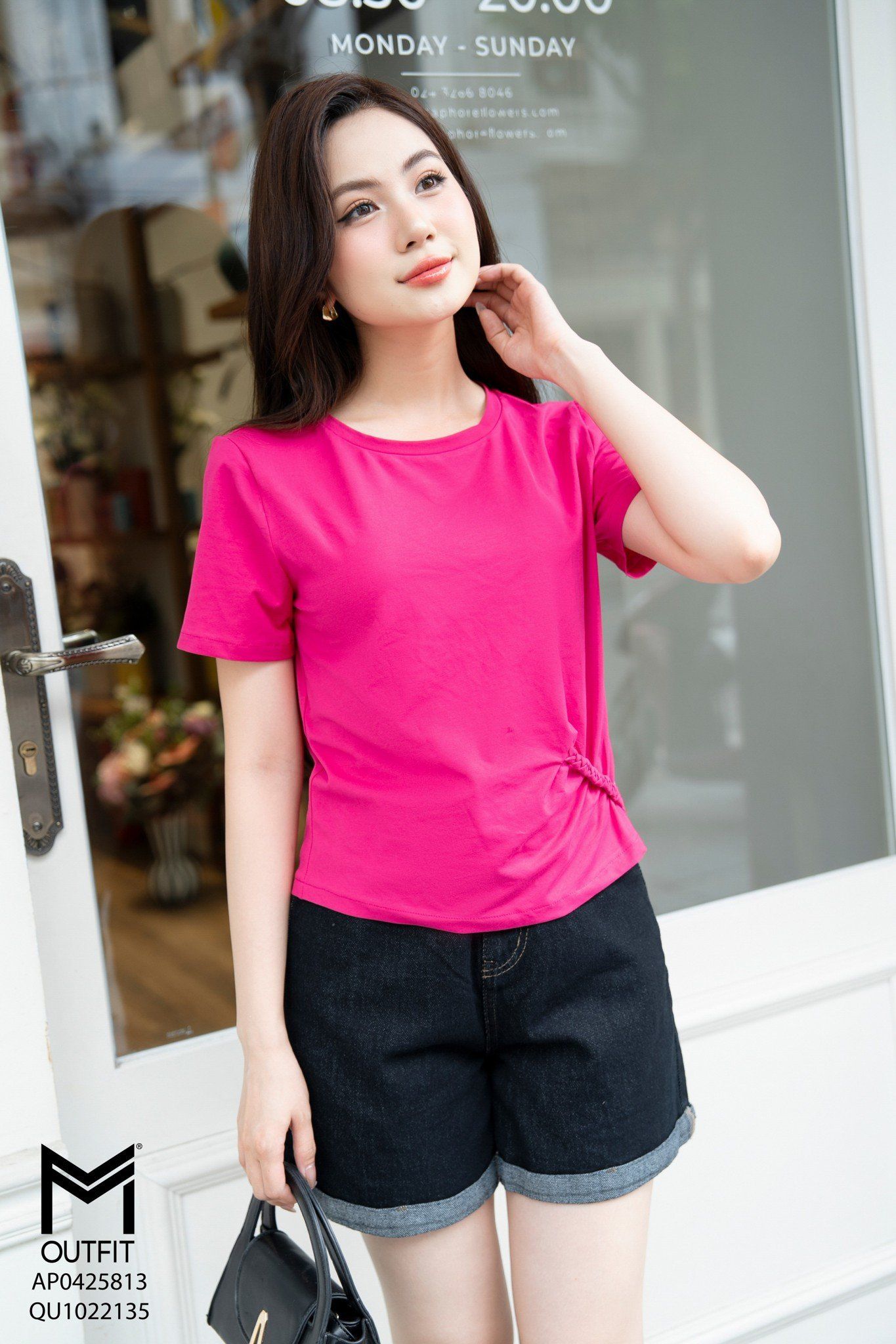 | Đặc điểm | Áo thun suông dáng croptop trang trí dây tết ở gấu áo |