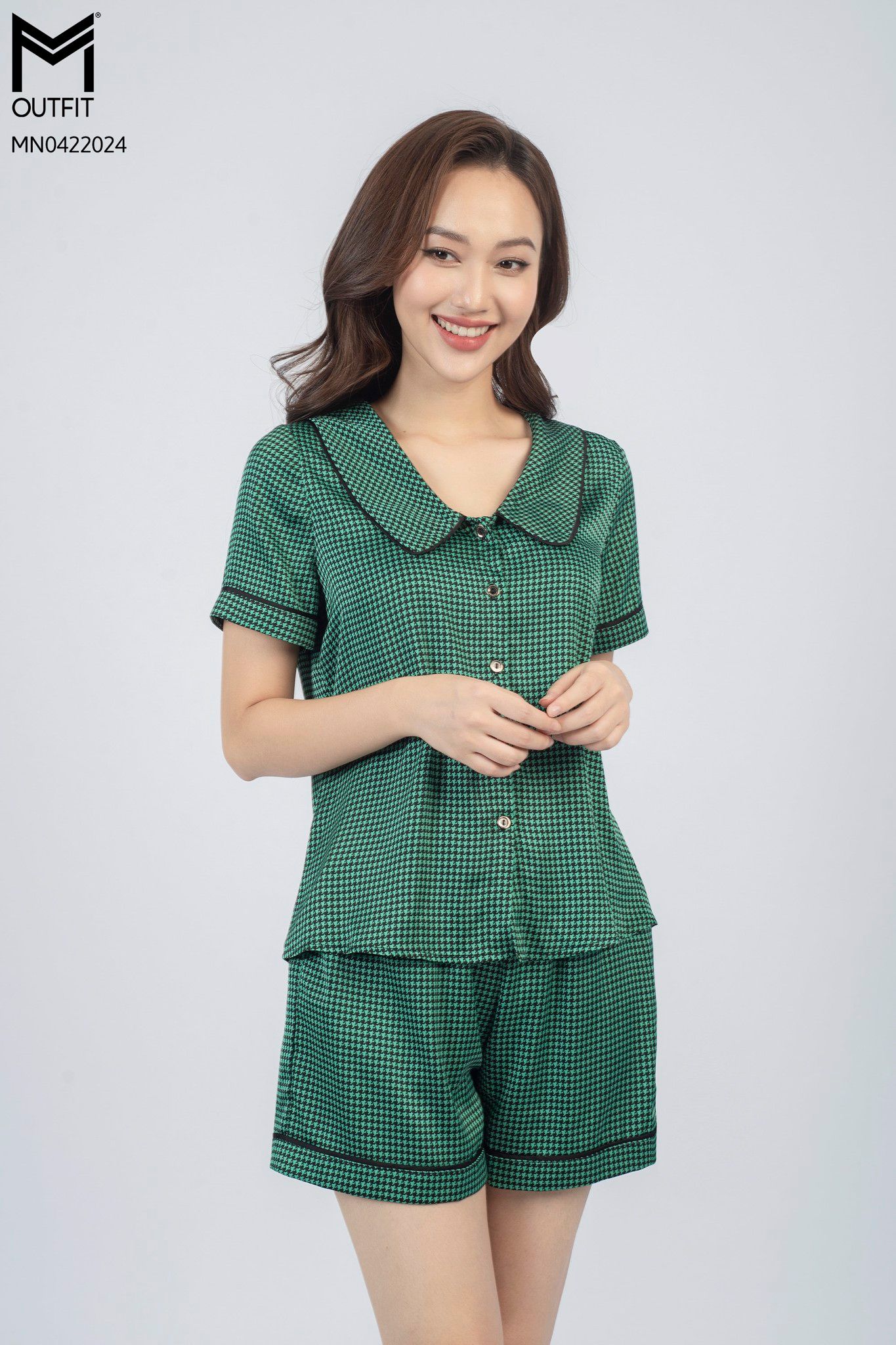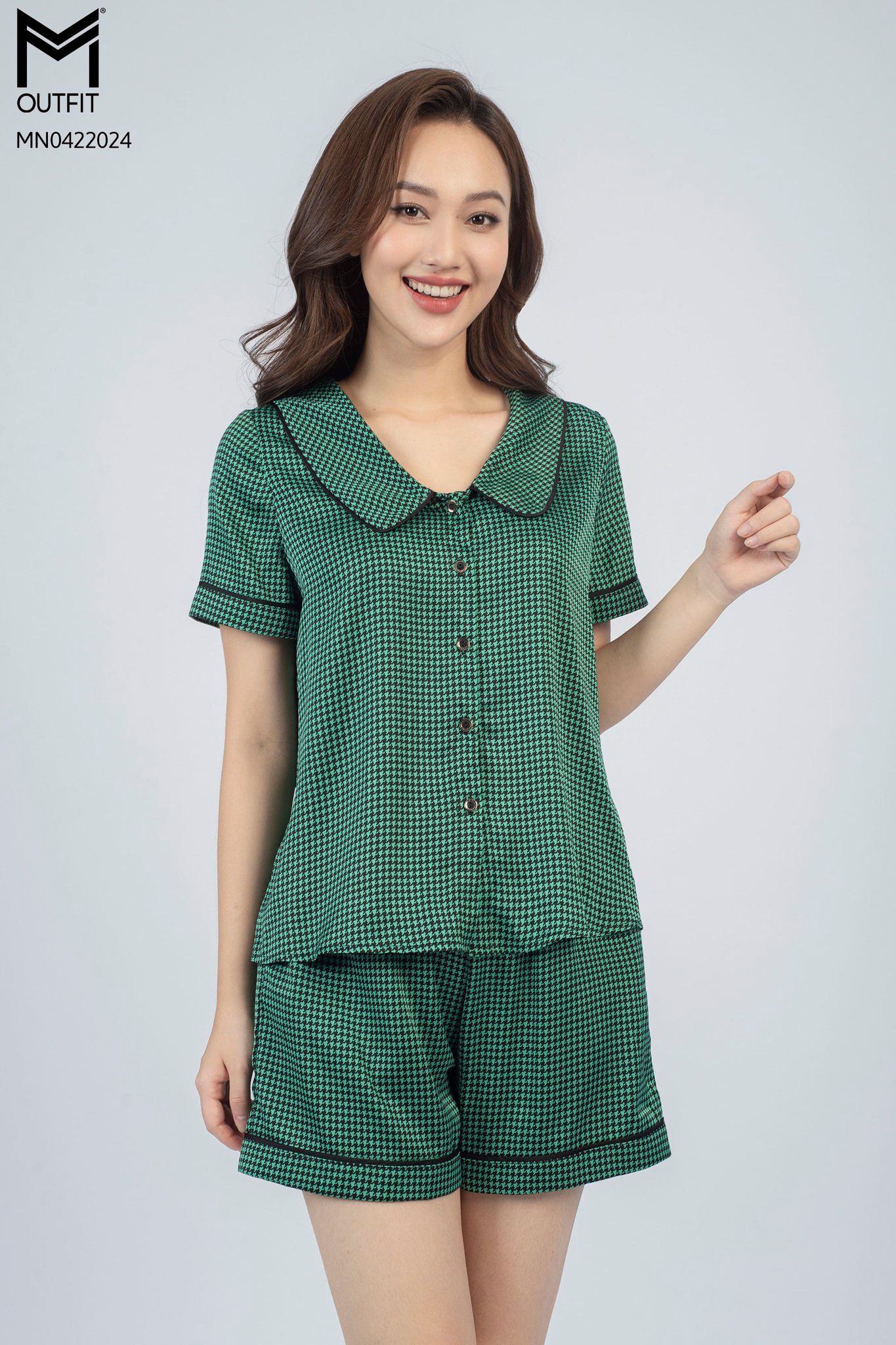 | Đặc điểm | Bộ mặc nhà, tay cộc, cổ lá sen, quần Sooc |
