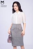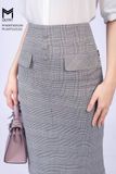 Chân váy ôm, họa tiết kẻ, đính cúc bọc, đính hai nắp túi trag trí