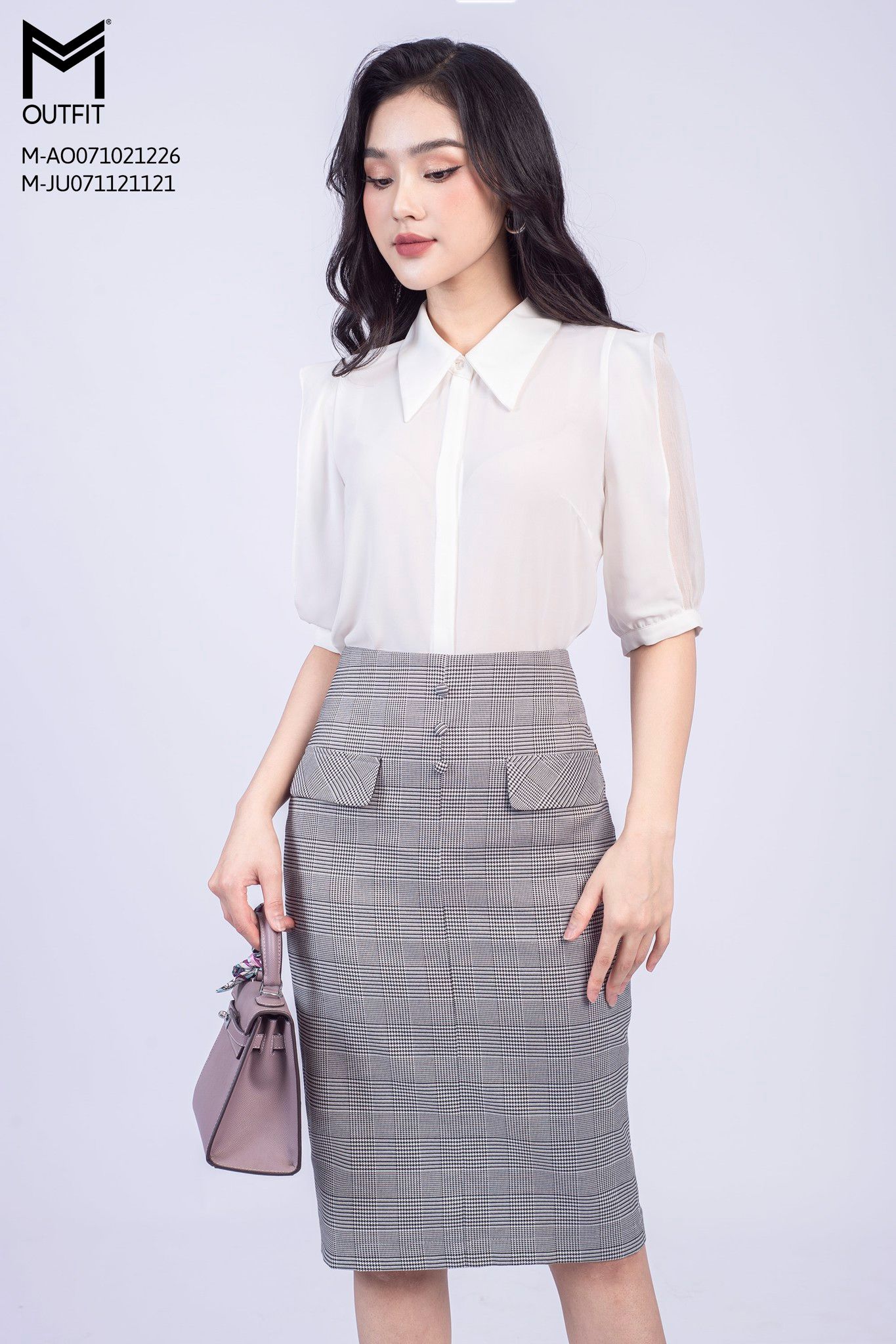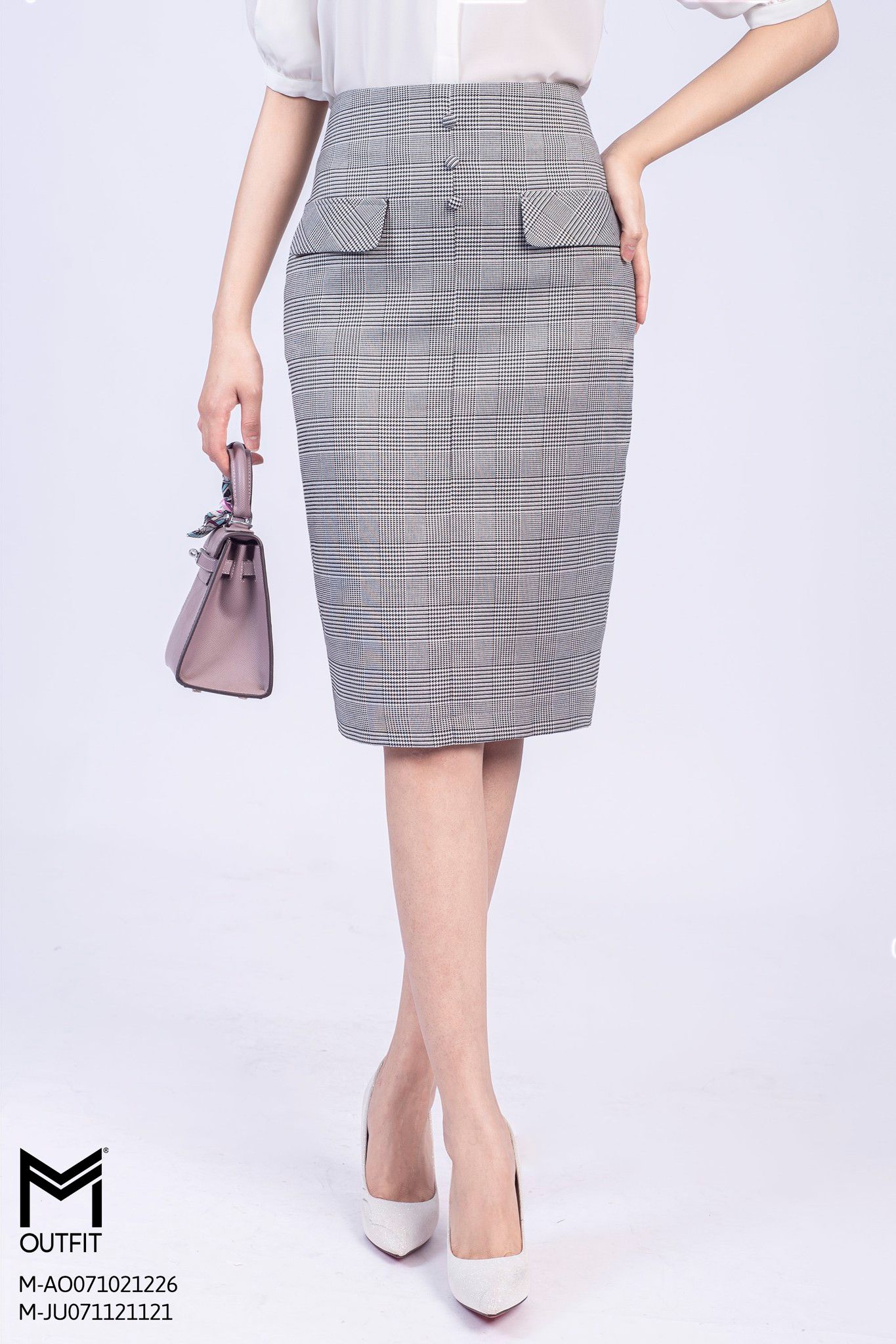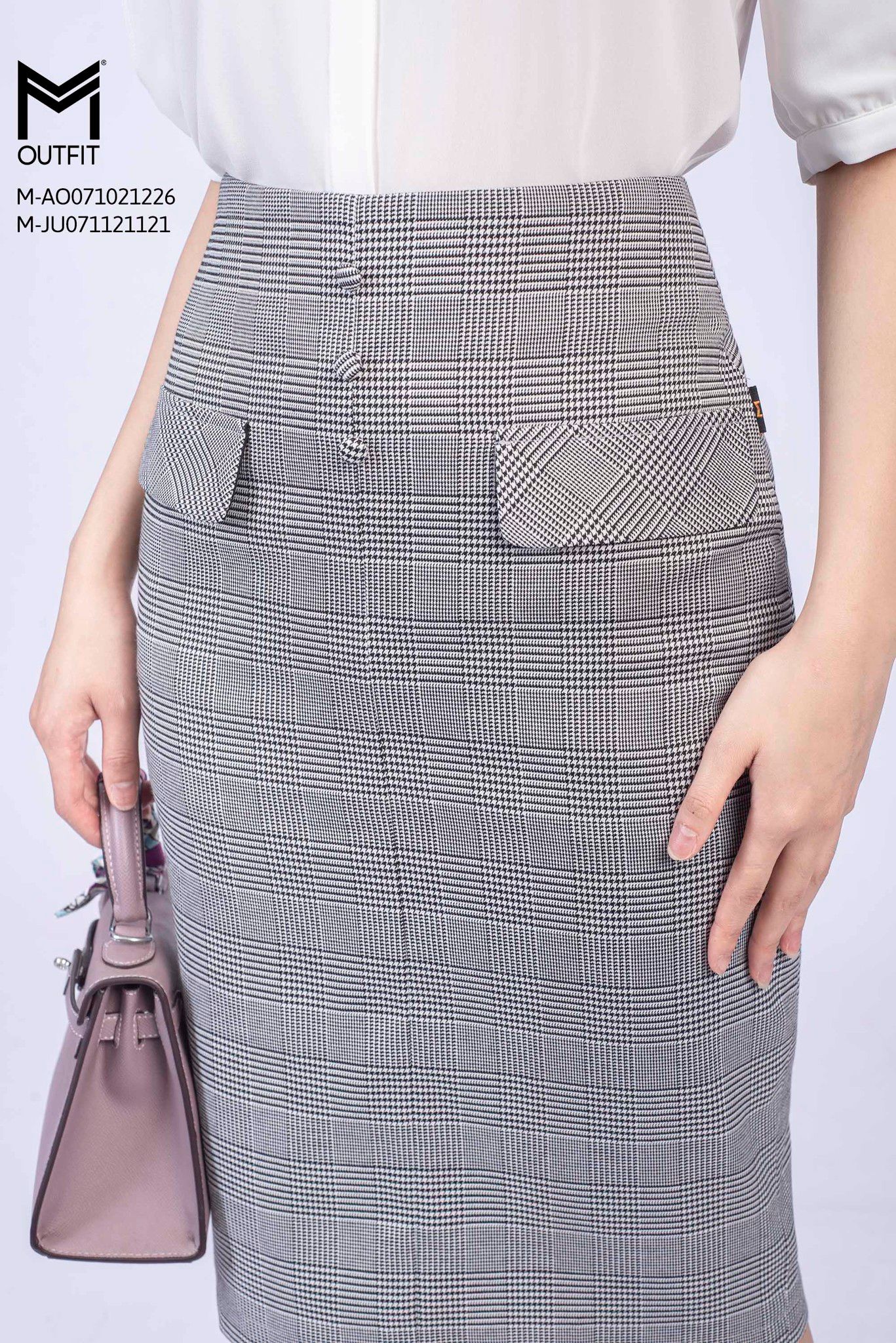| Đặc điểm | Chân váy ôm, họa tiết kẻ, đính cúc bọc, đính hai nắp túi trag trí |