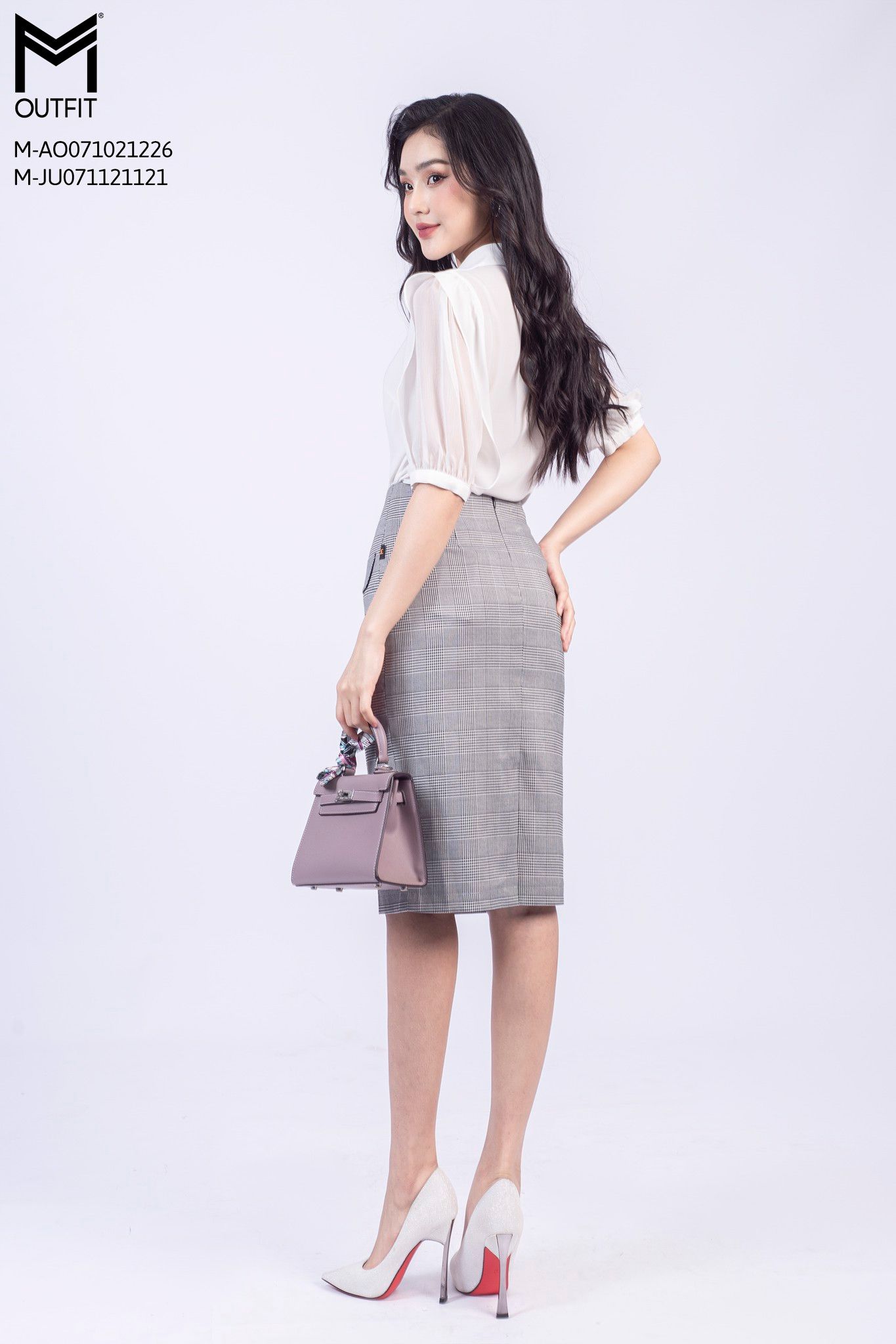 Chân váy dáng ôm, họa tiết kẻ