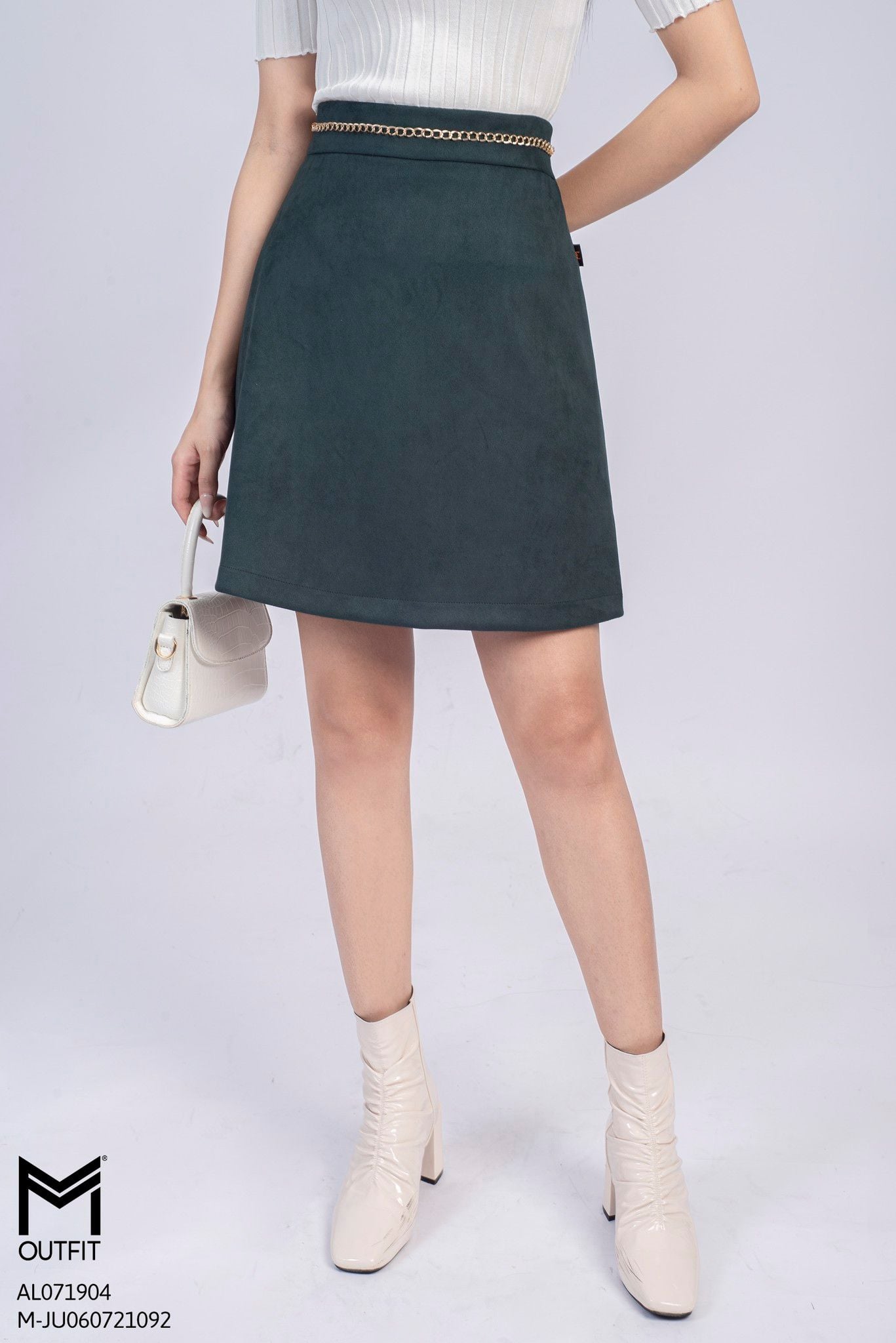 | Đặc điểm | Chân váy chữ A thiết kế dáng ngắn, đính xích trang trí |
