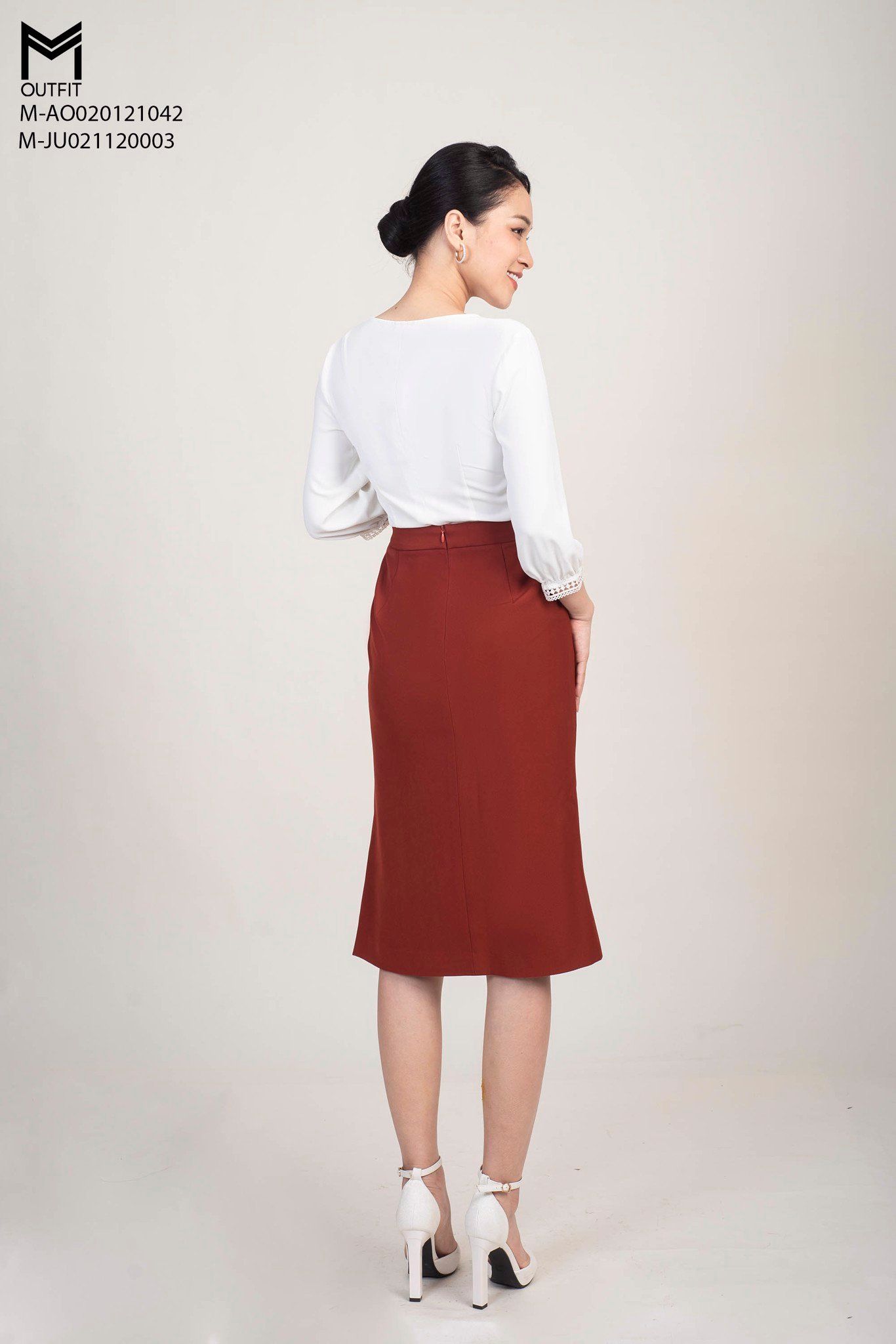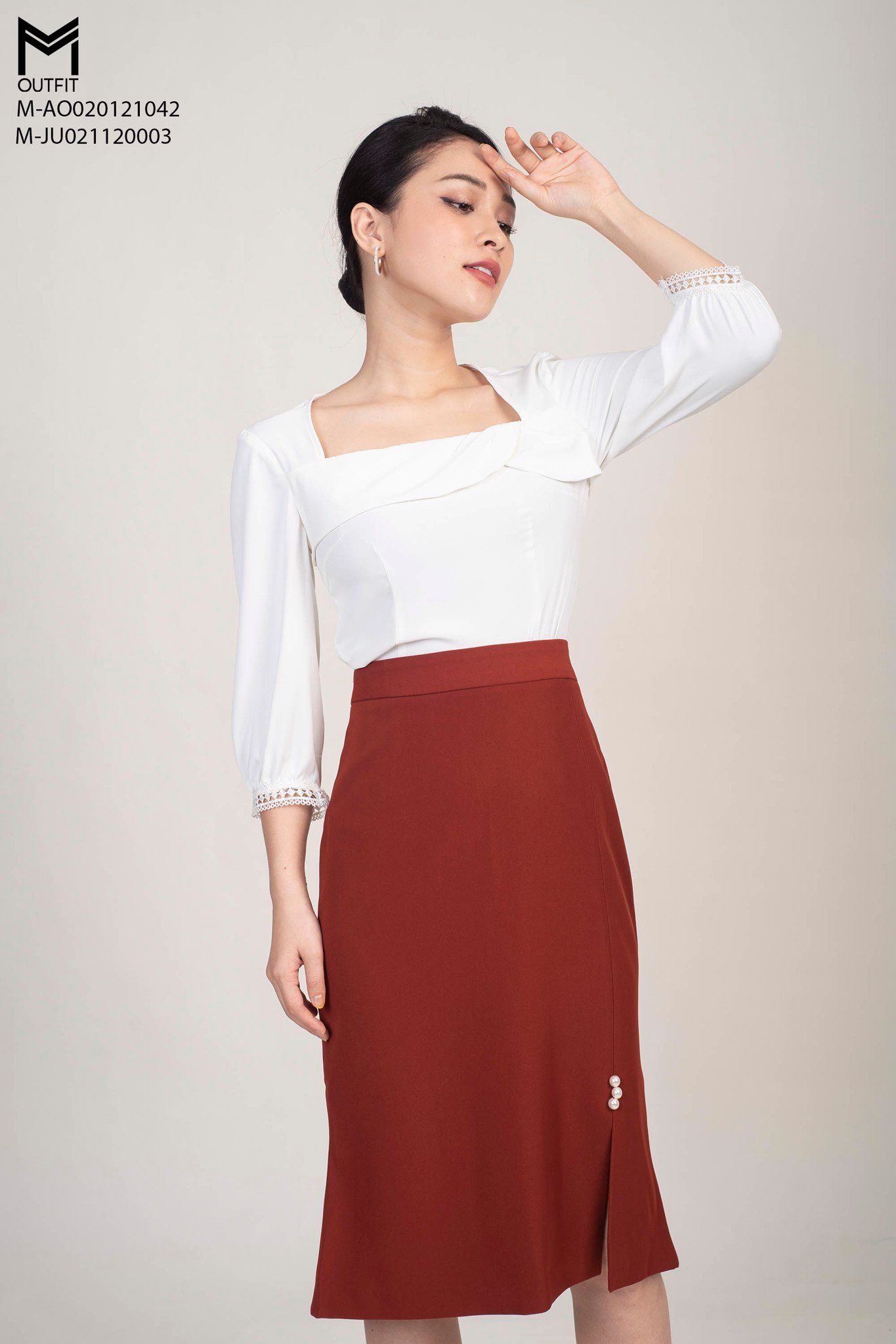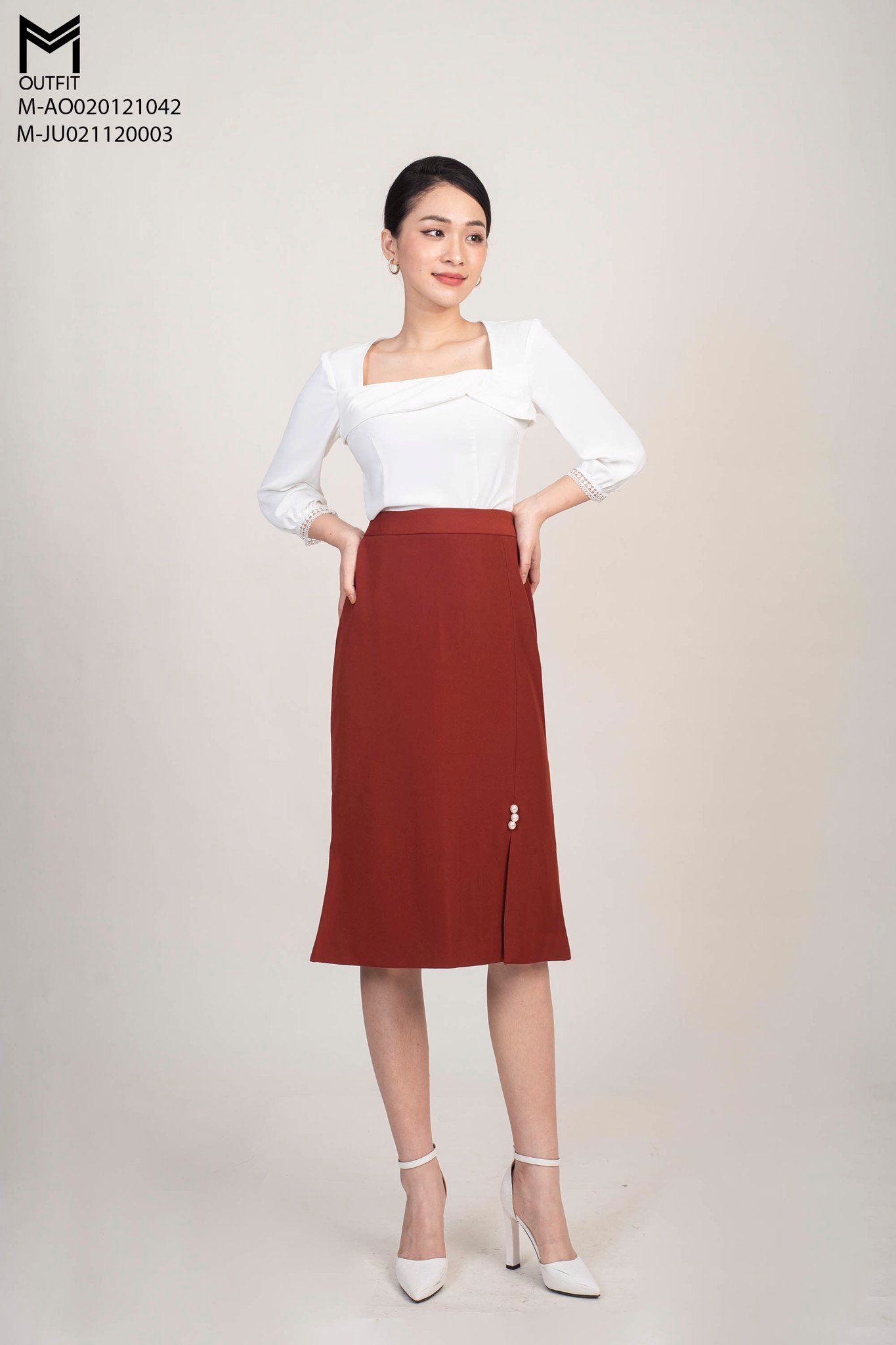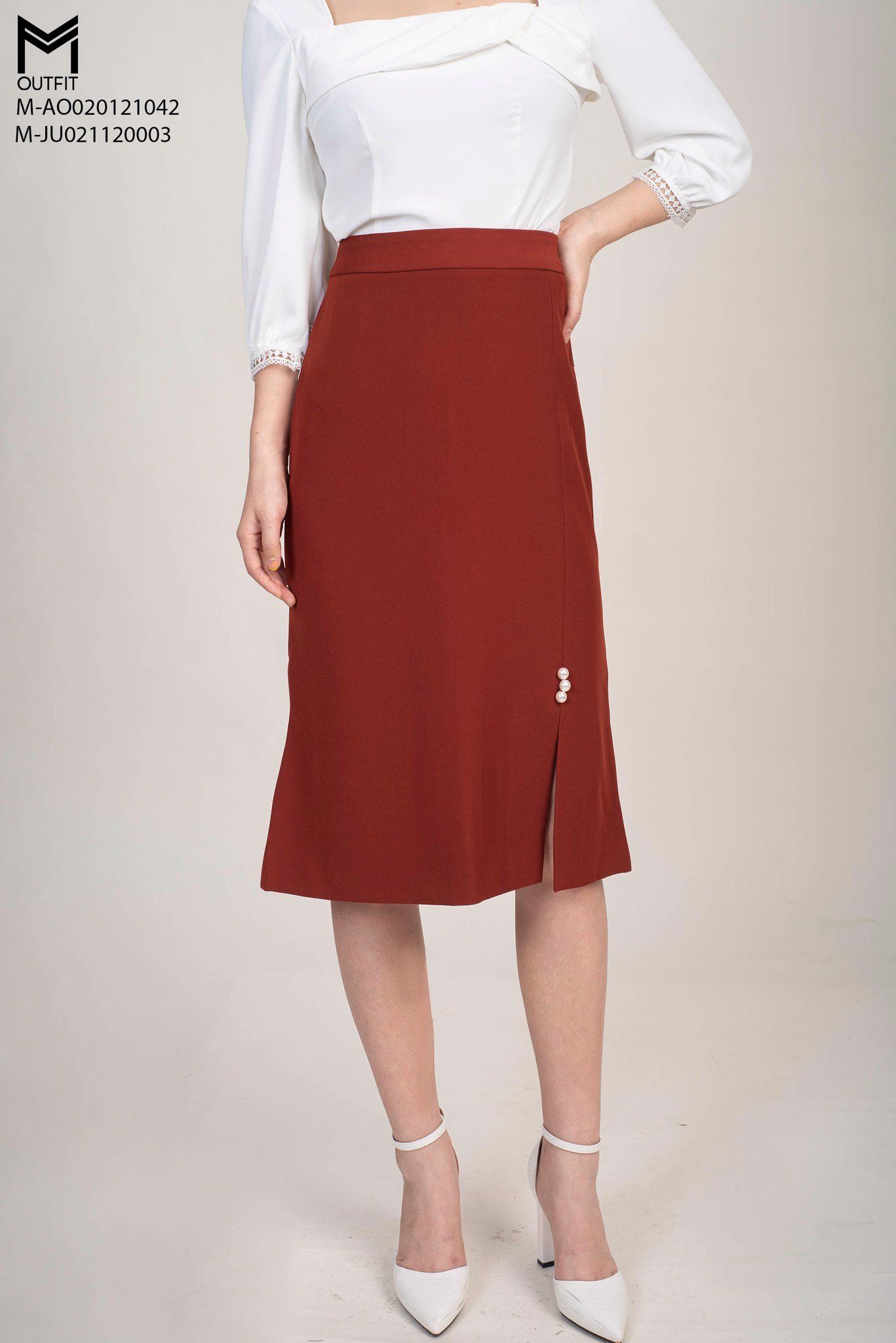 Chân váy chữ A, có độ co giãn thoải mái khi mặc với thiết kế đuôi cá có phần xẻ thân trước đính mấy hạt trai nhẹ nhàng.