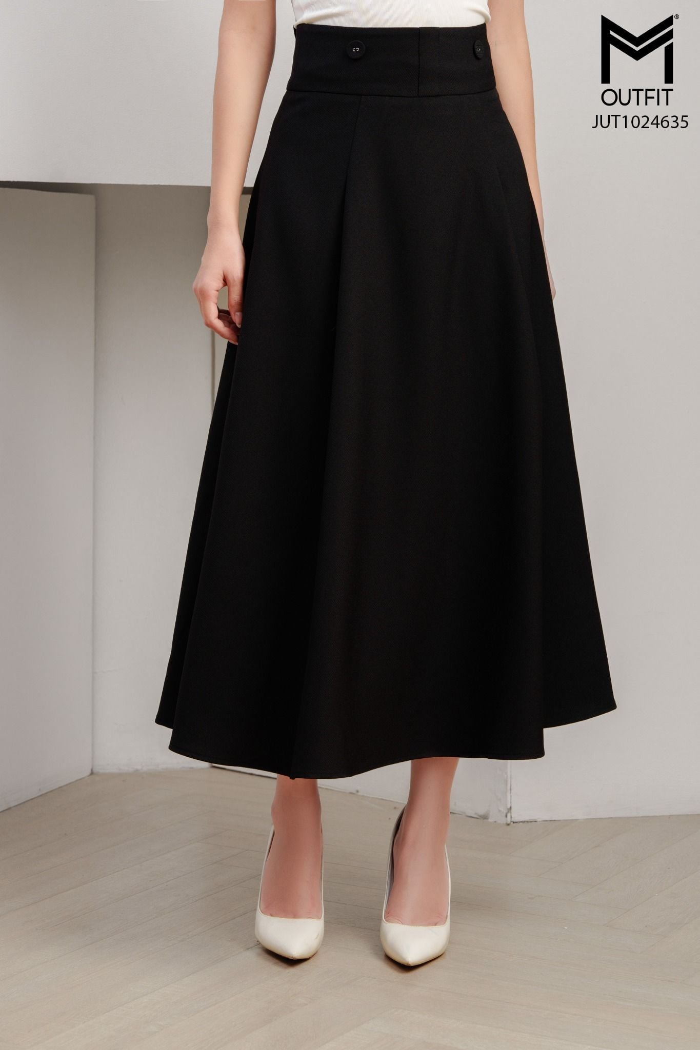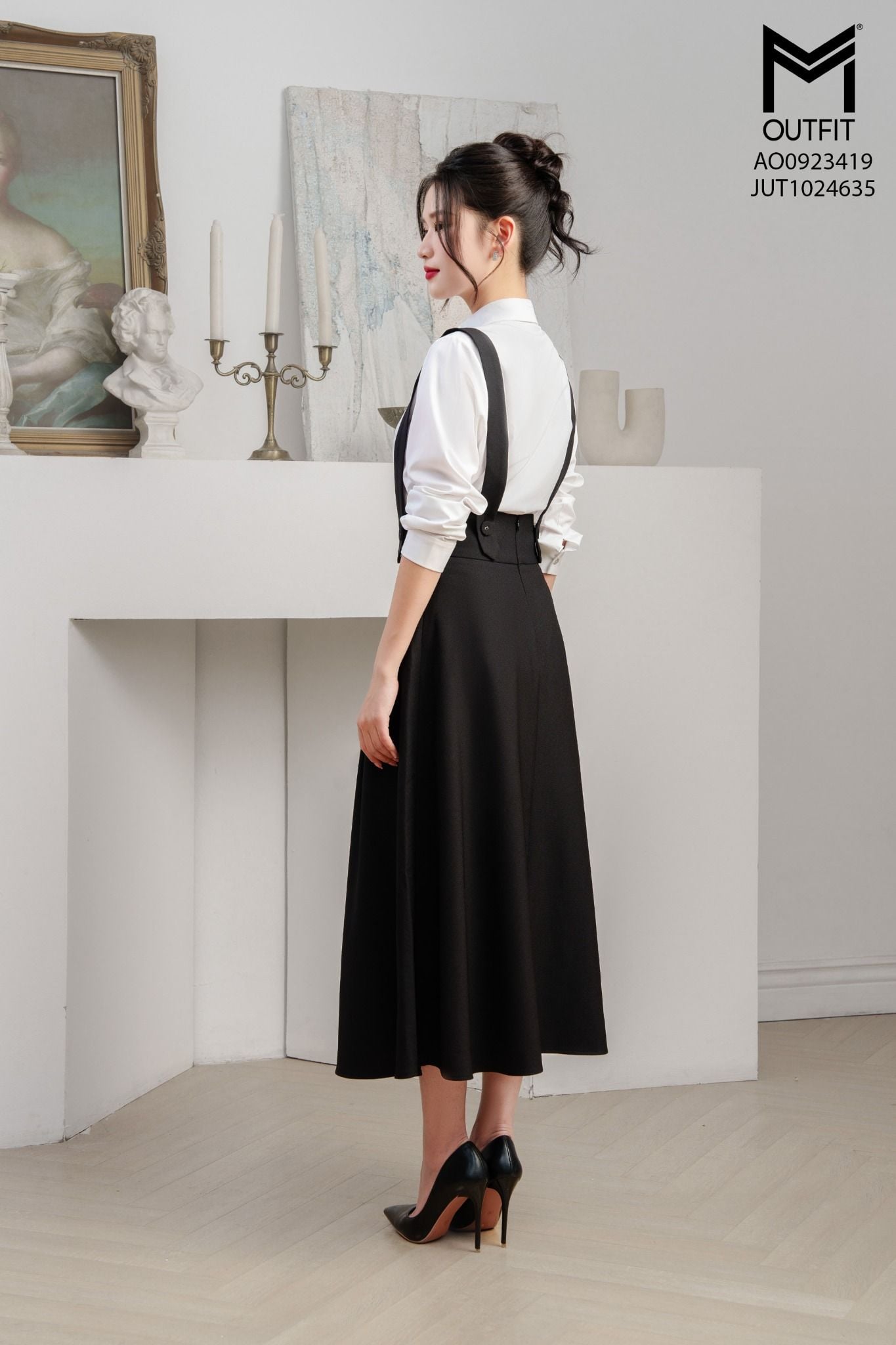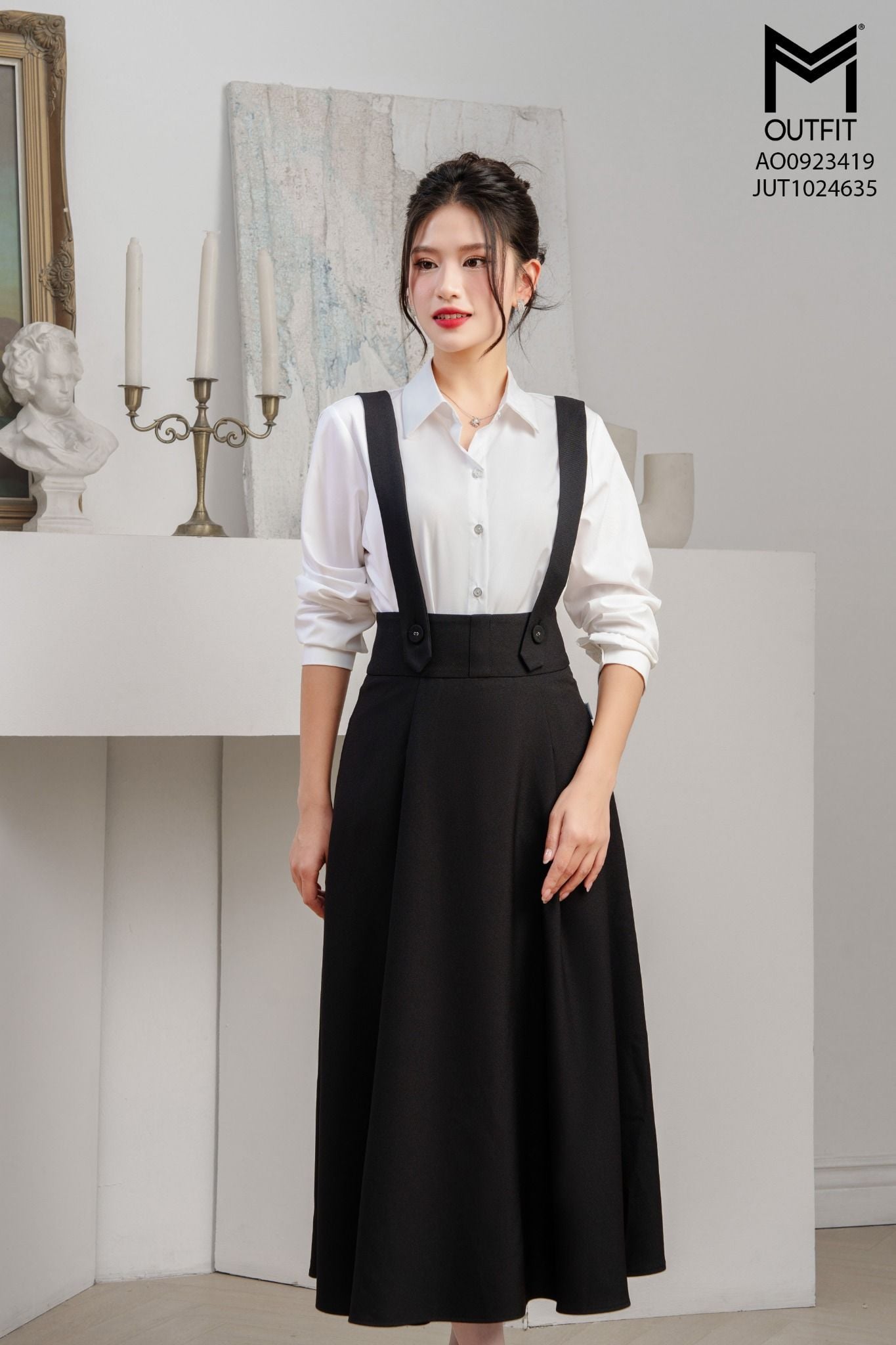 | Đặc điểm | Chân váy xòe cài đai yếm đính cúc bọc |