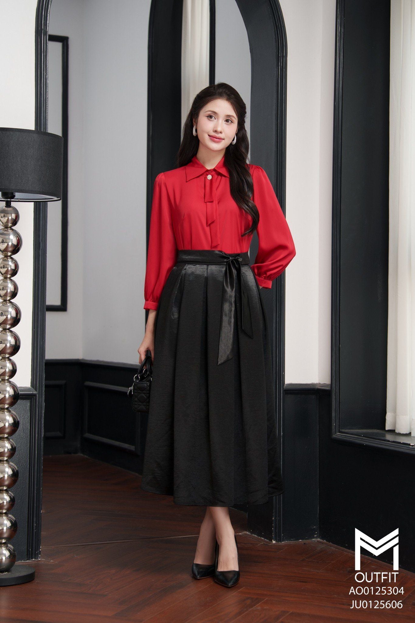 Chân váy xòe xếp ly có dây nơ cạp dài 85cm