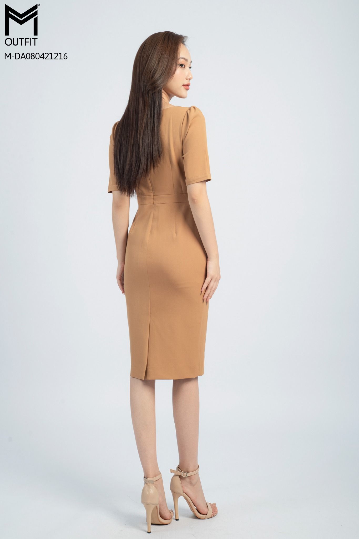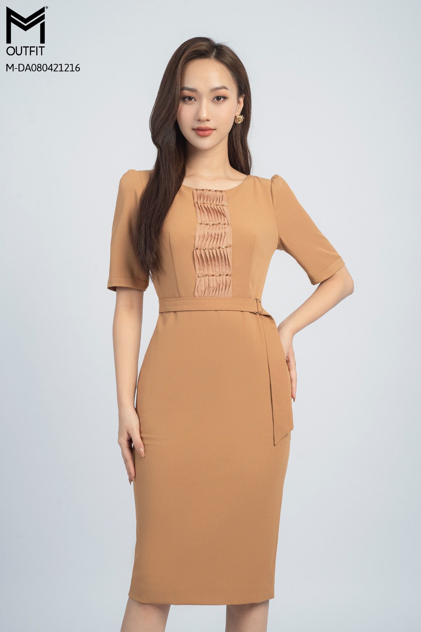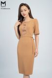 | Đặc điểm | Đầm bút chì, cổ tròn, đính hạt cườm trang trí, đai nơ liền |