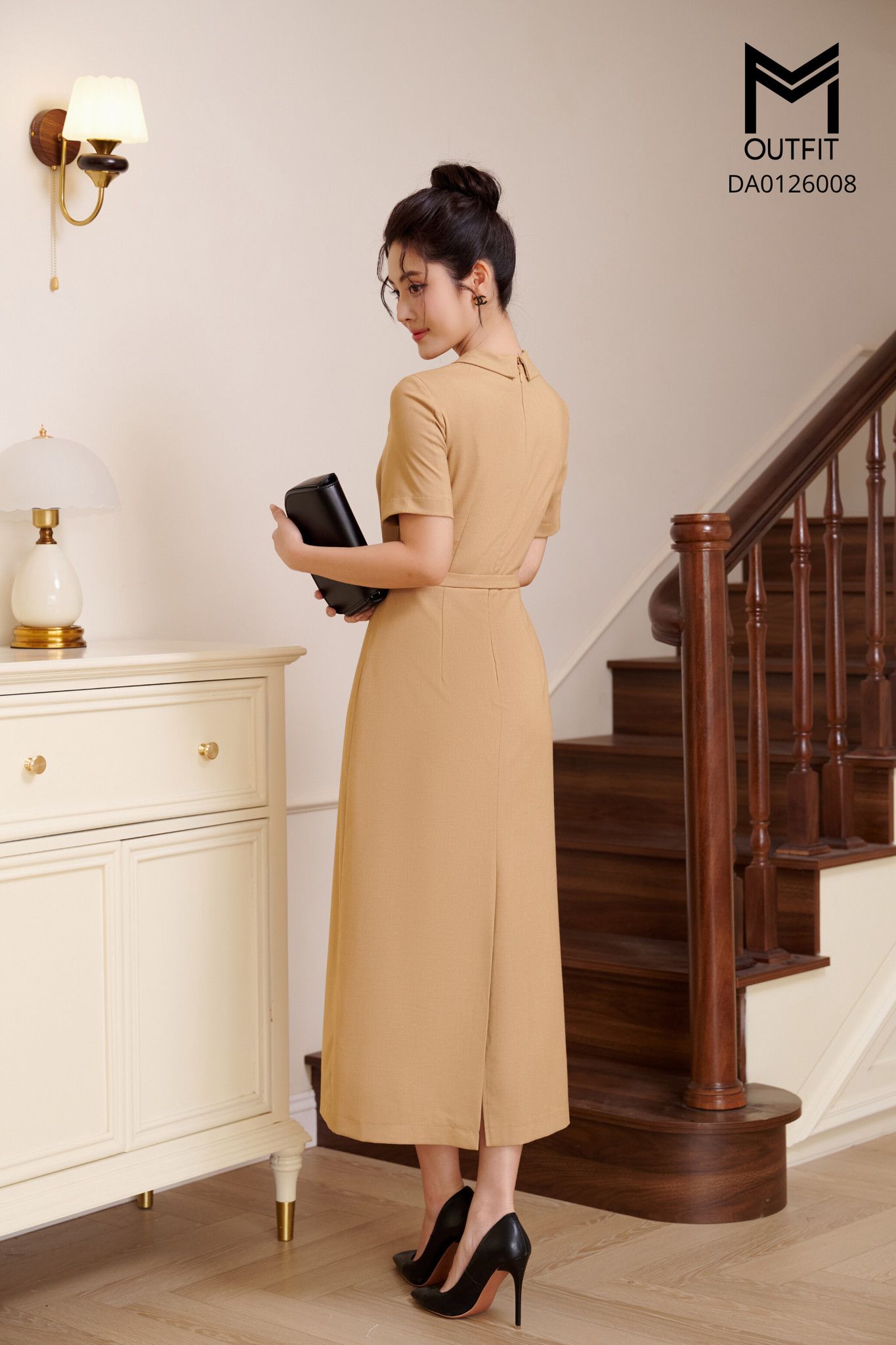 | Đặc điểm | Đầm dáng A cổ bèo cách điệu có đai cài |