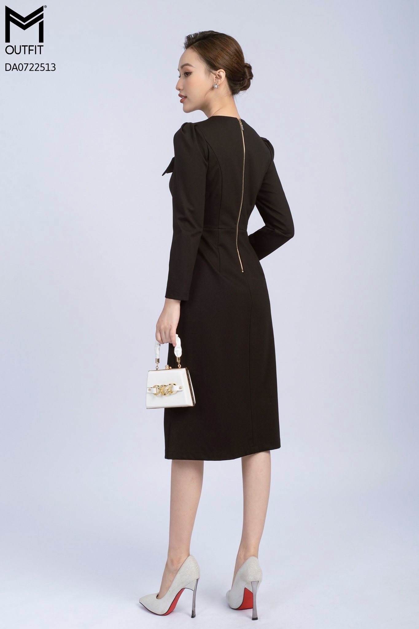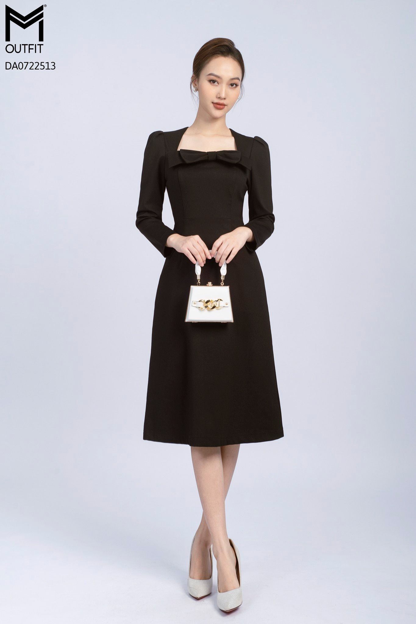 | Đặc điểm | Đầm dáng A, tay dài, đính nơ trước ngực |