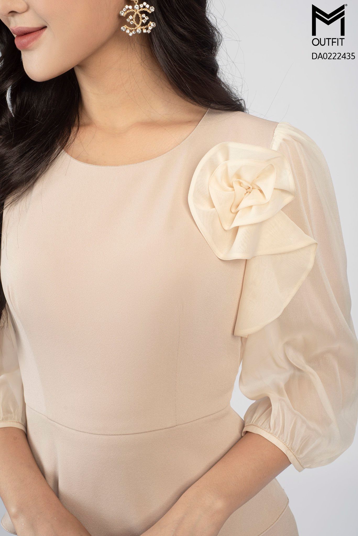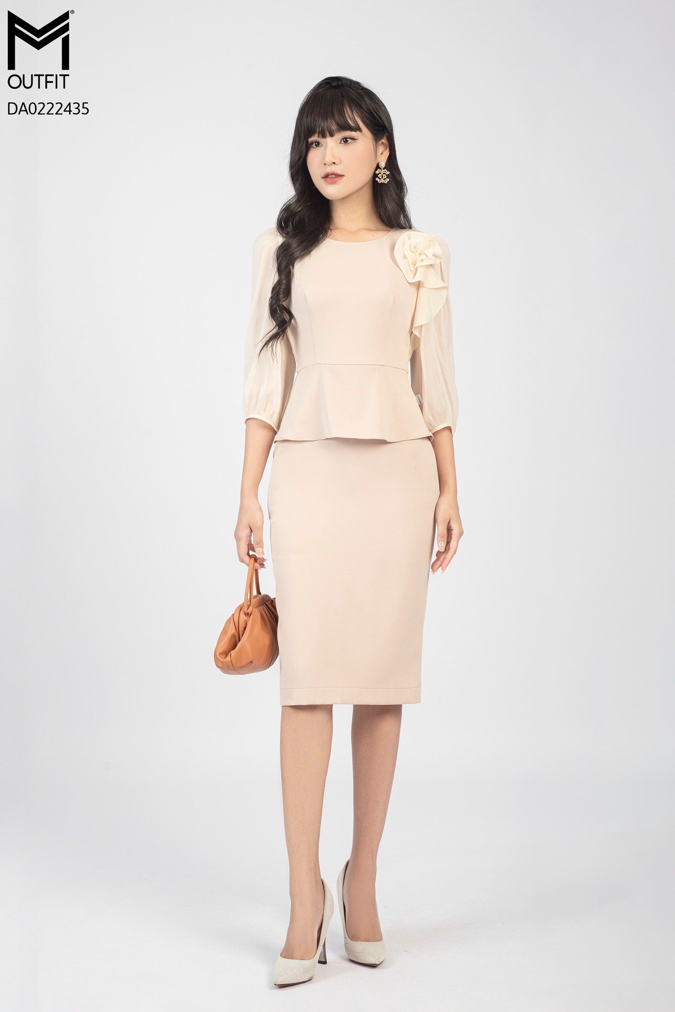 | Đặc điểm | Đầm dáng bút chì, tà peplum, tay dài phối voan |