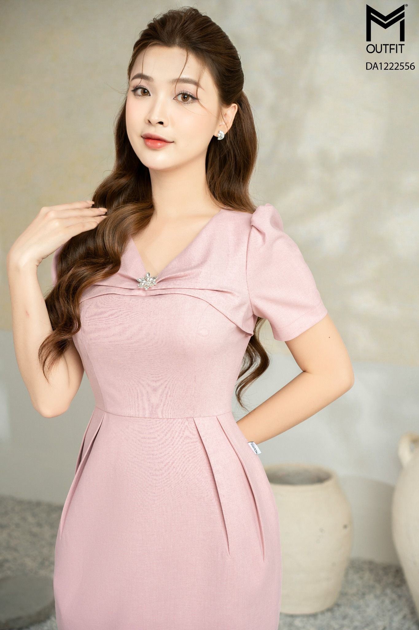 | Đặc điểm | Đầm dáng ôm, tà bong xếp ly cài trâm đá |